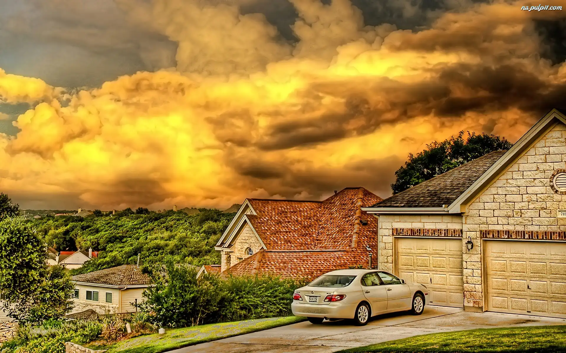 Auto, Domy, Chmury, Podjazd