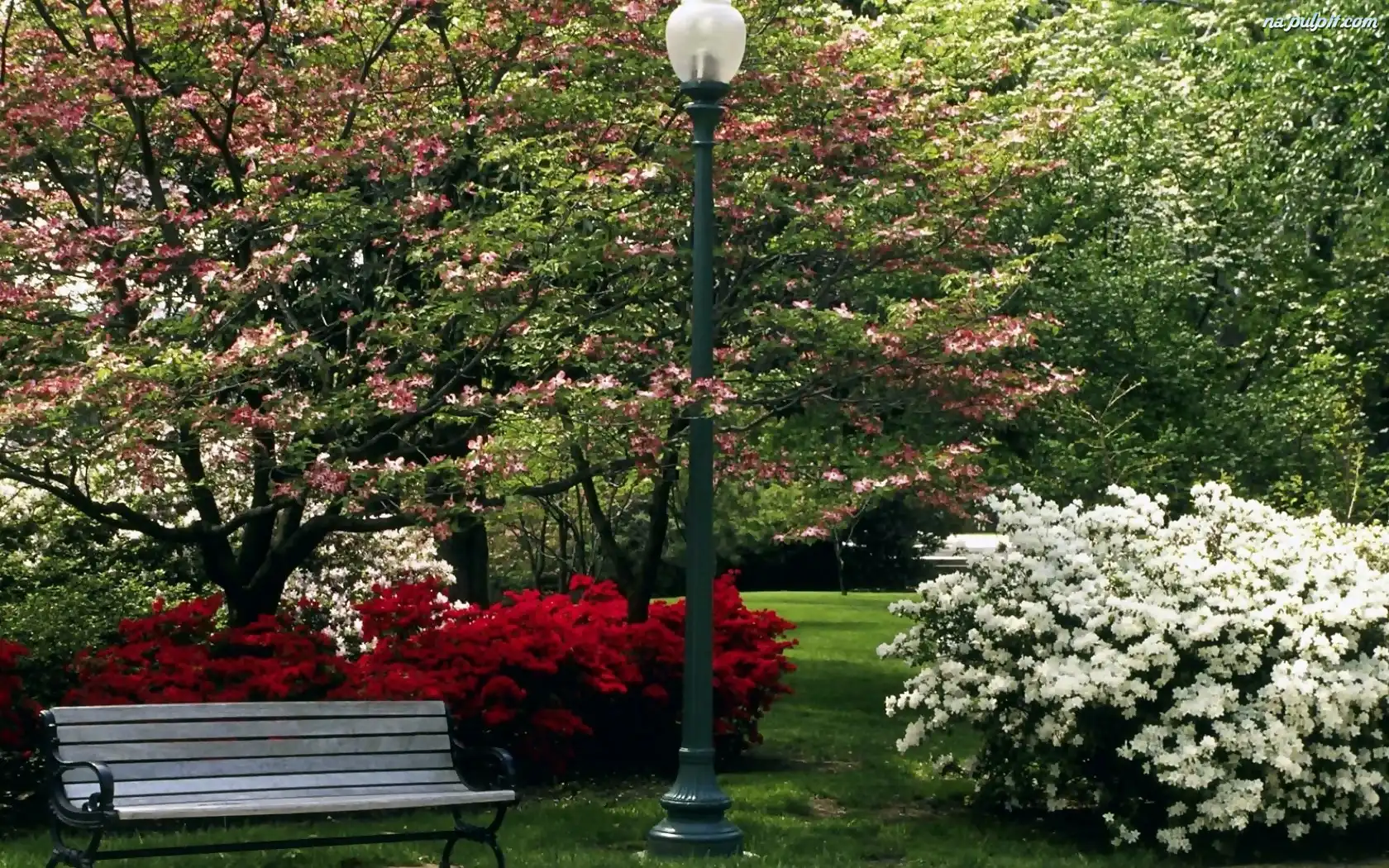 Ławeczka, Park, Latarnia, Drzewa, Kwitnące, Central, Krzewy Na Pulpit