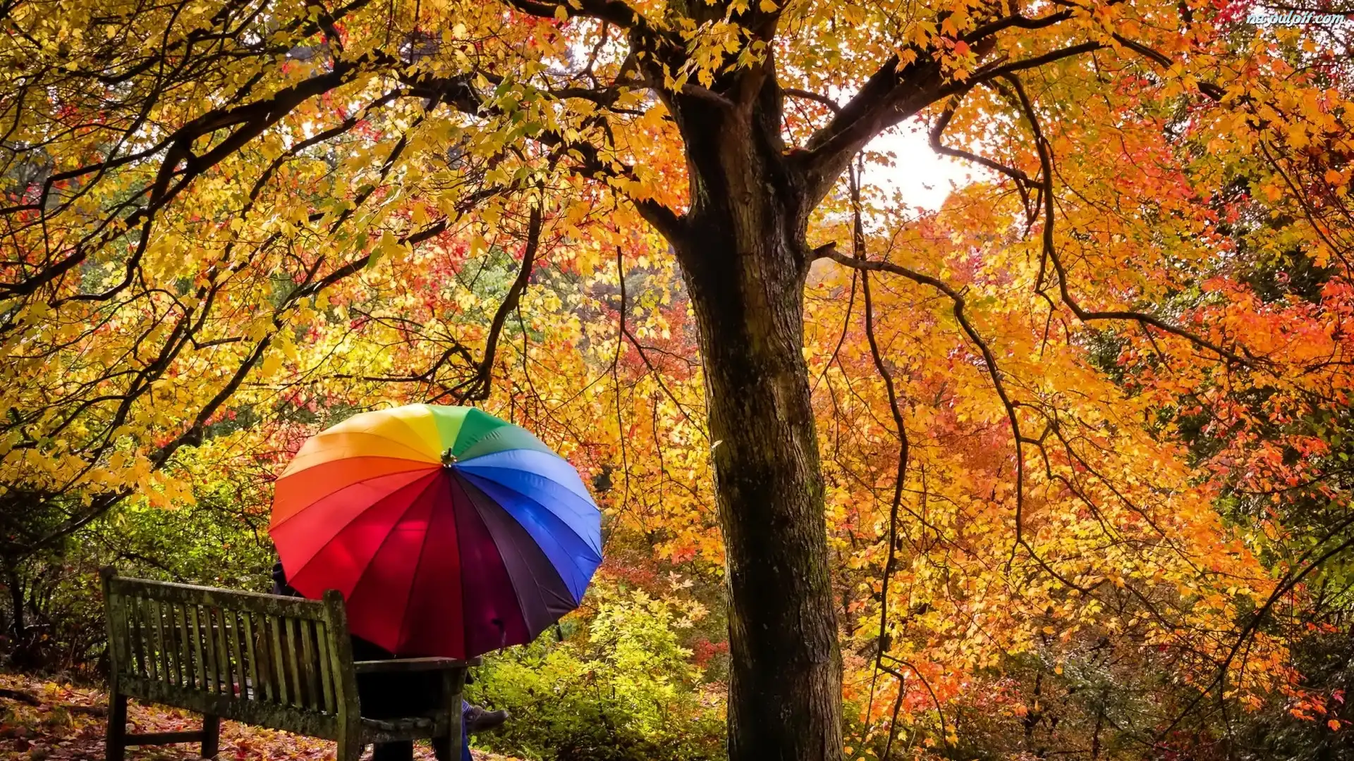 Ławka, Drzewa, Jesień, Kolorowa, Para, Parasolka Na Pulpit