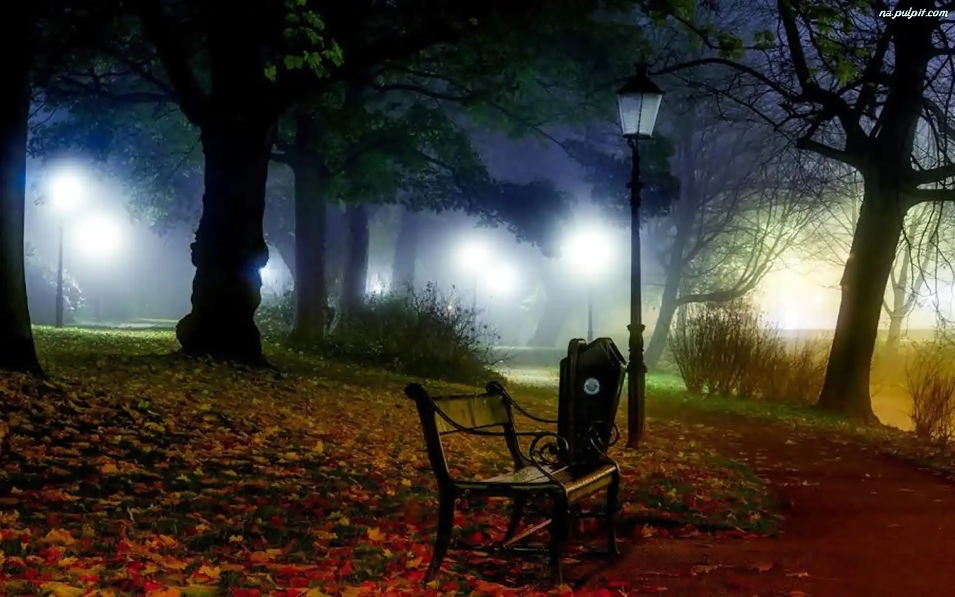 Jesień, Ławka, Poranek, Liście, Latarnia, Park, Mgła Na Pulpit