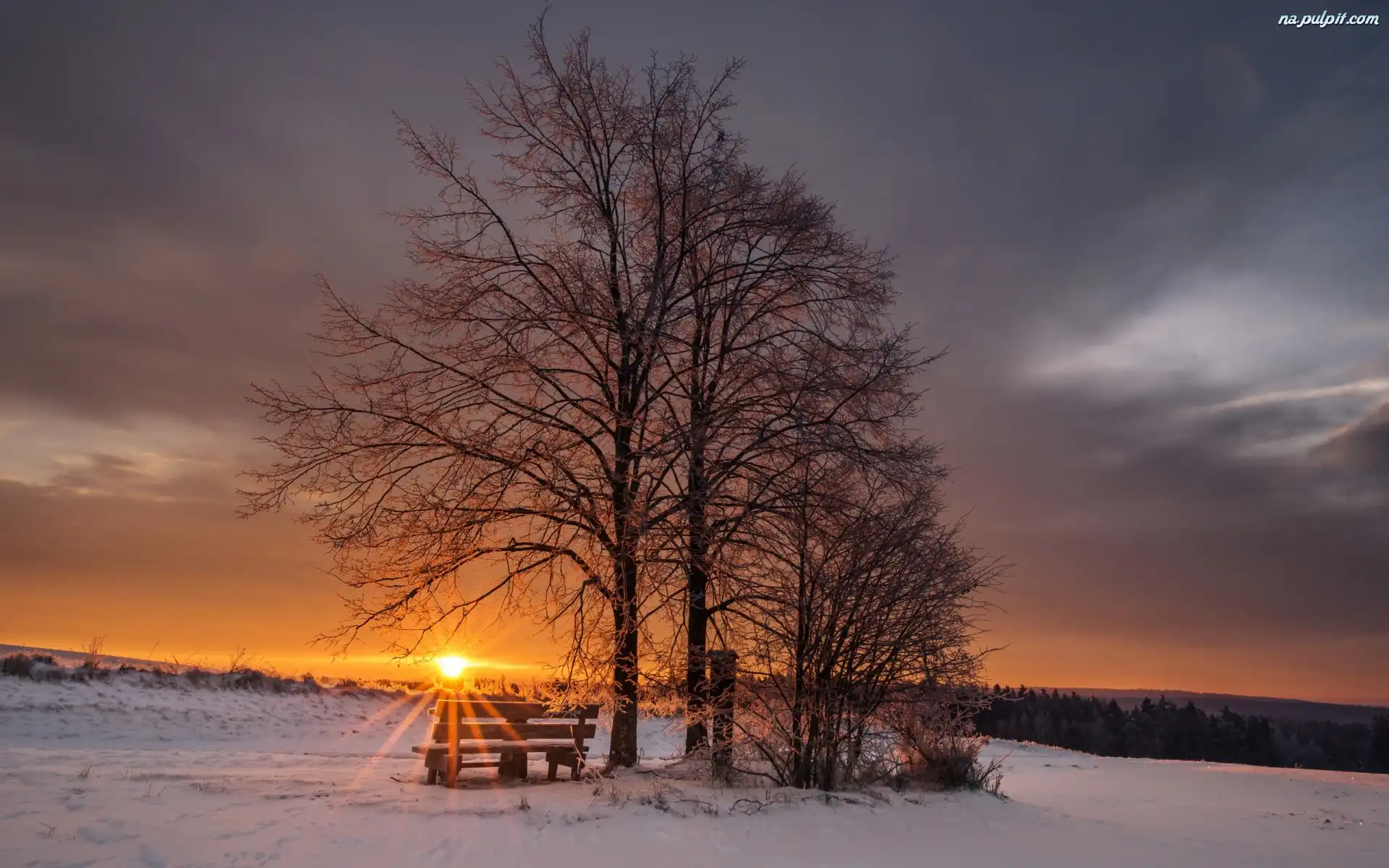 Drzewa, Bawaria, Śnieg, Zachód słońca, Górny Palatynat, Niemcy, Ławka Na Pulpit