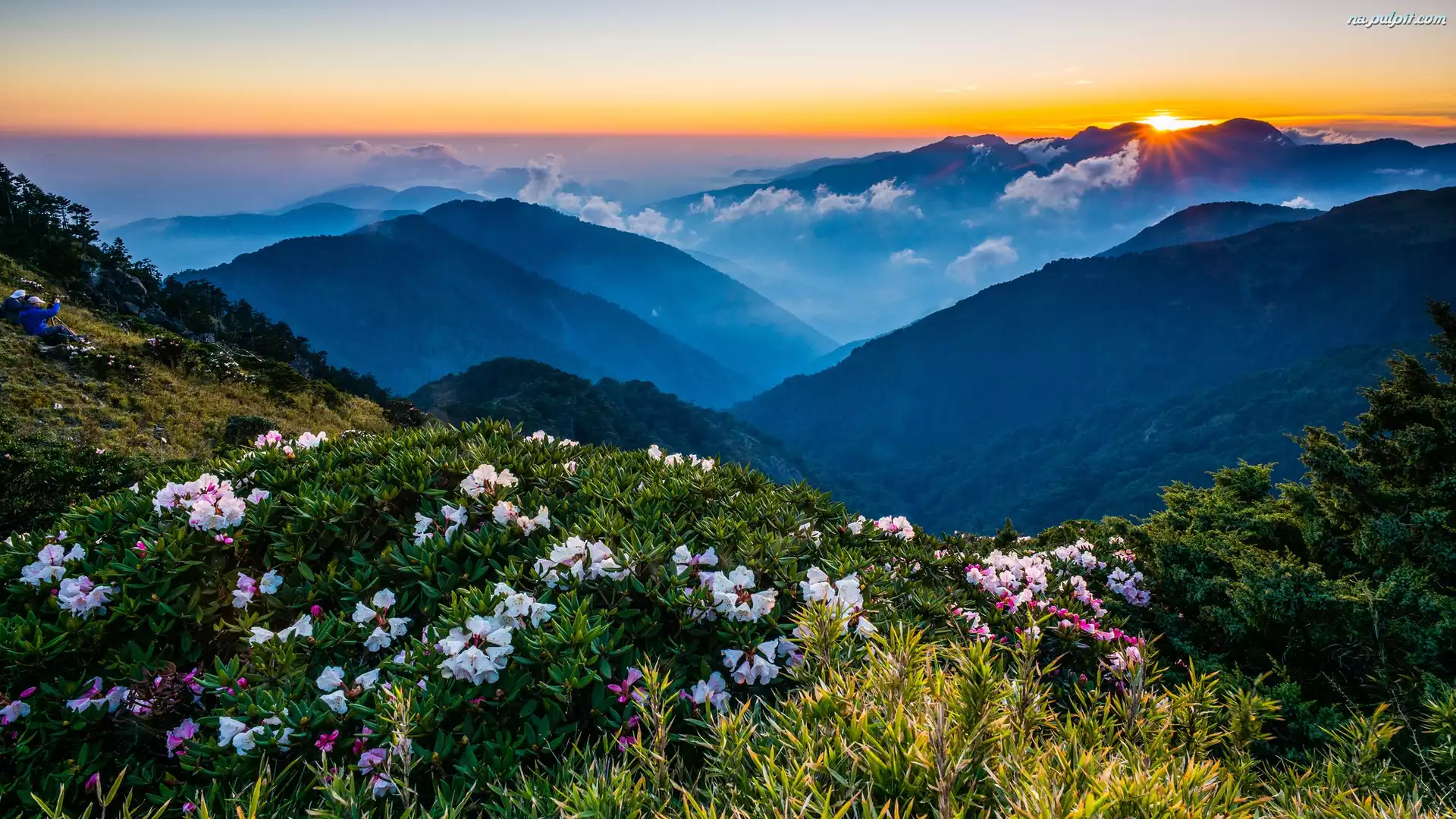 Azalie, Polana, Mgła, Góry, Zachód słońca, Niebo, Kwiaty, Rododendrony
