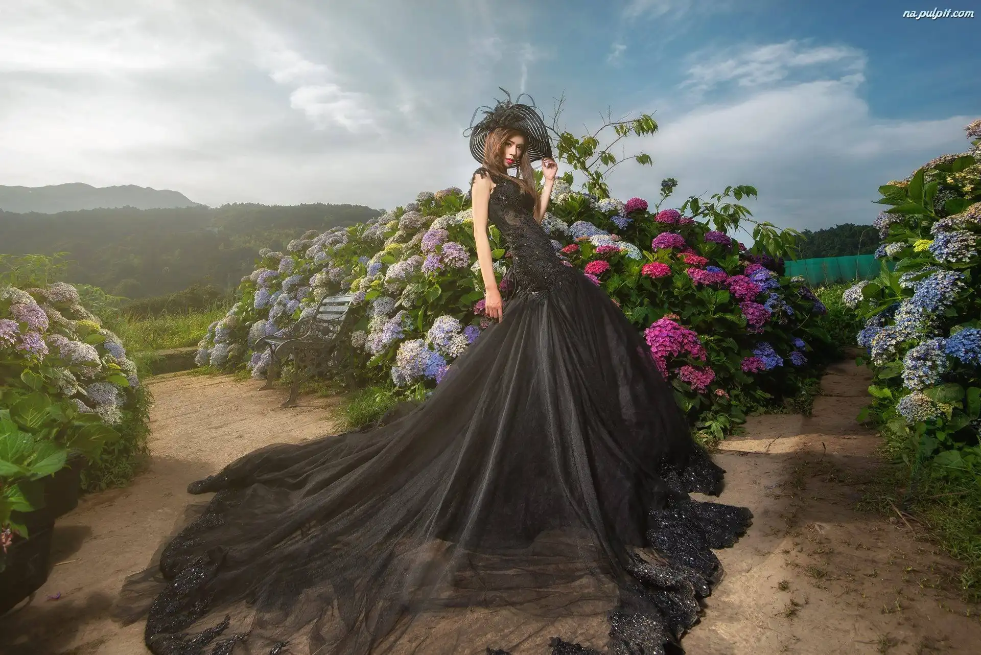Hortensje, Azjatka, Ogród, Suknia, Czarna, Kobieta, Kapelusz Na Pulpit