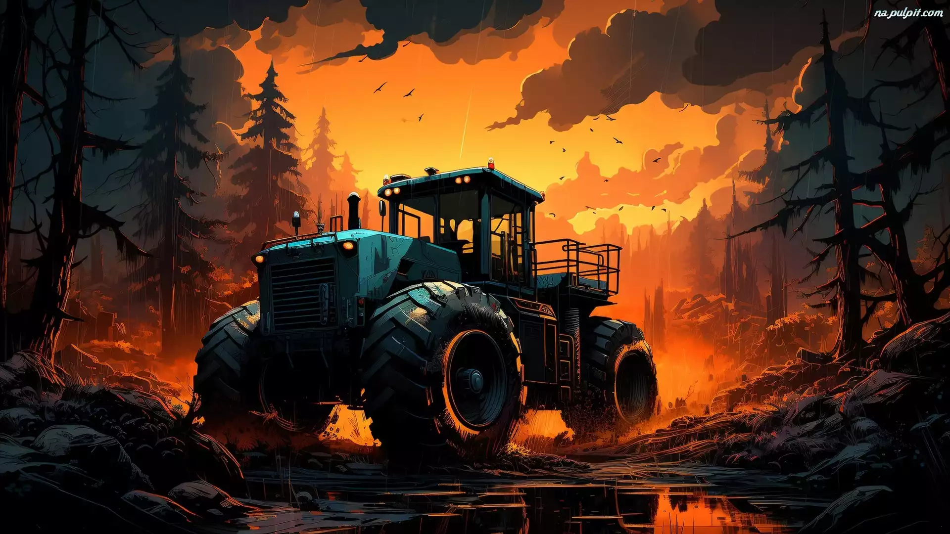 Traktor, Grafika, Las, Bagno, Zachód słońca