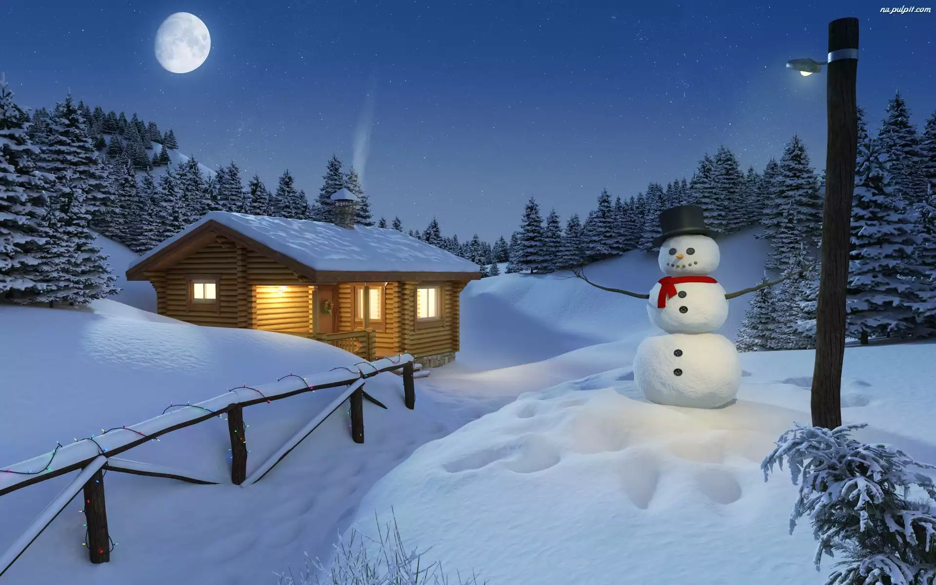 Noc, Dom, Lasy, Bałwanek, Góry, Zima Na Pulpit