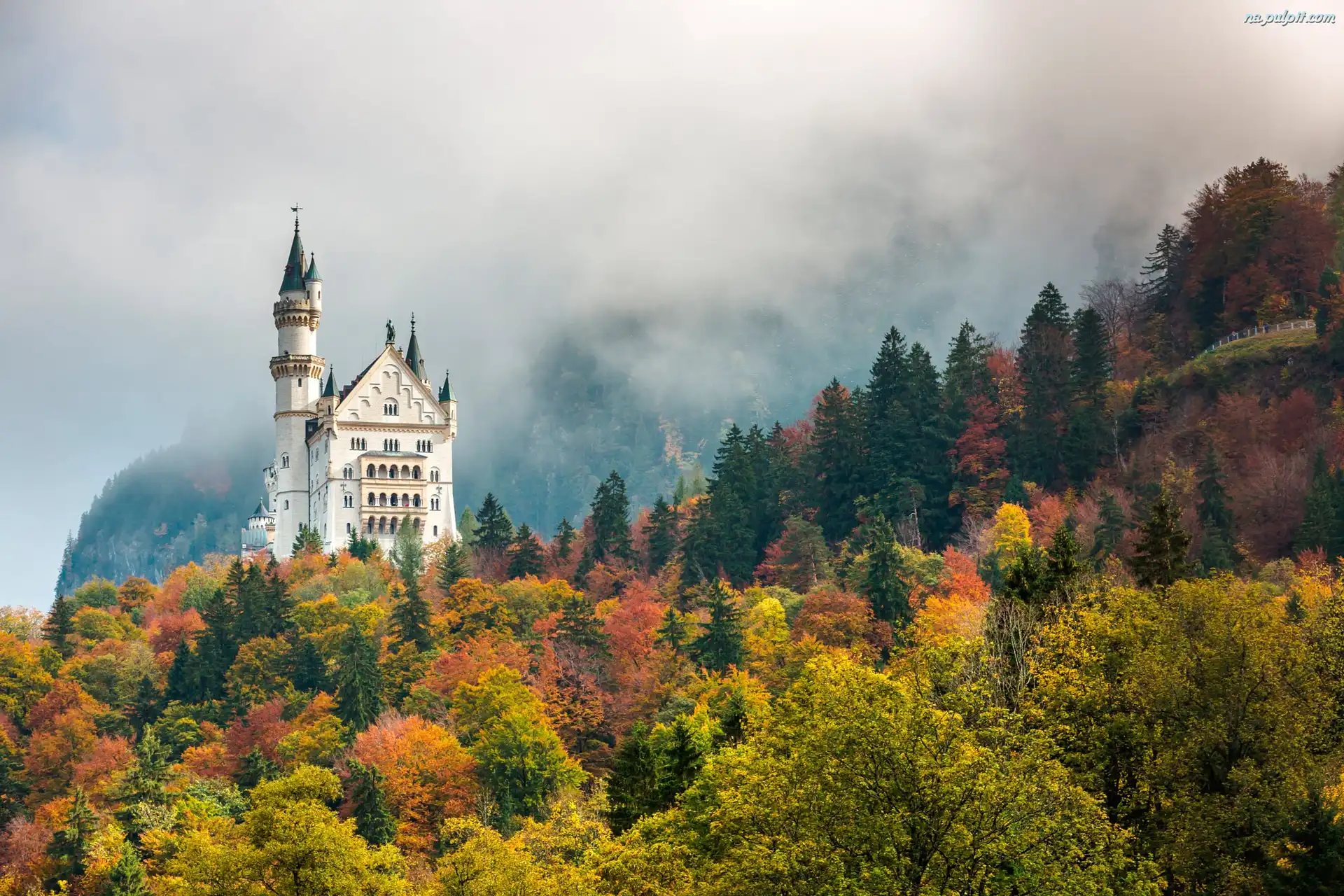 Drzewa, Bawaria, Las, Jesień, Zamek Neuschwanstein, Niemcy, Mgła Na Pulpit