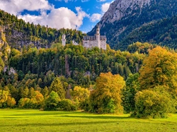 Niemcy, Drzewa, Skały, Zamek Neuschwanstein, Jesień, Góry, Bawaria