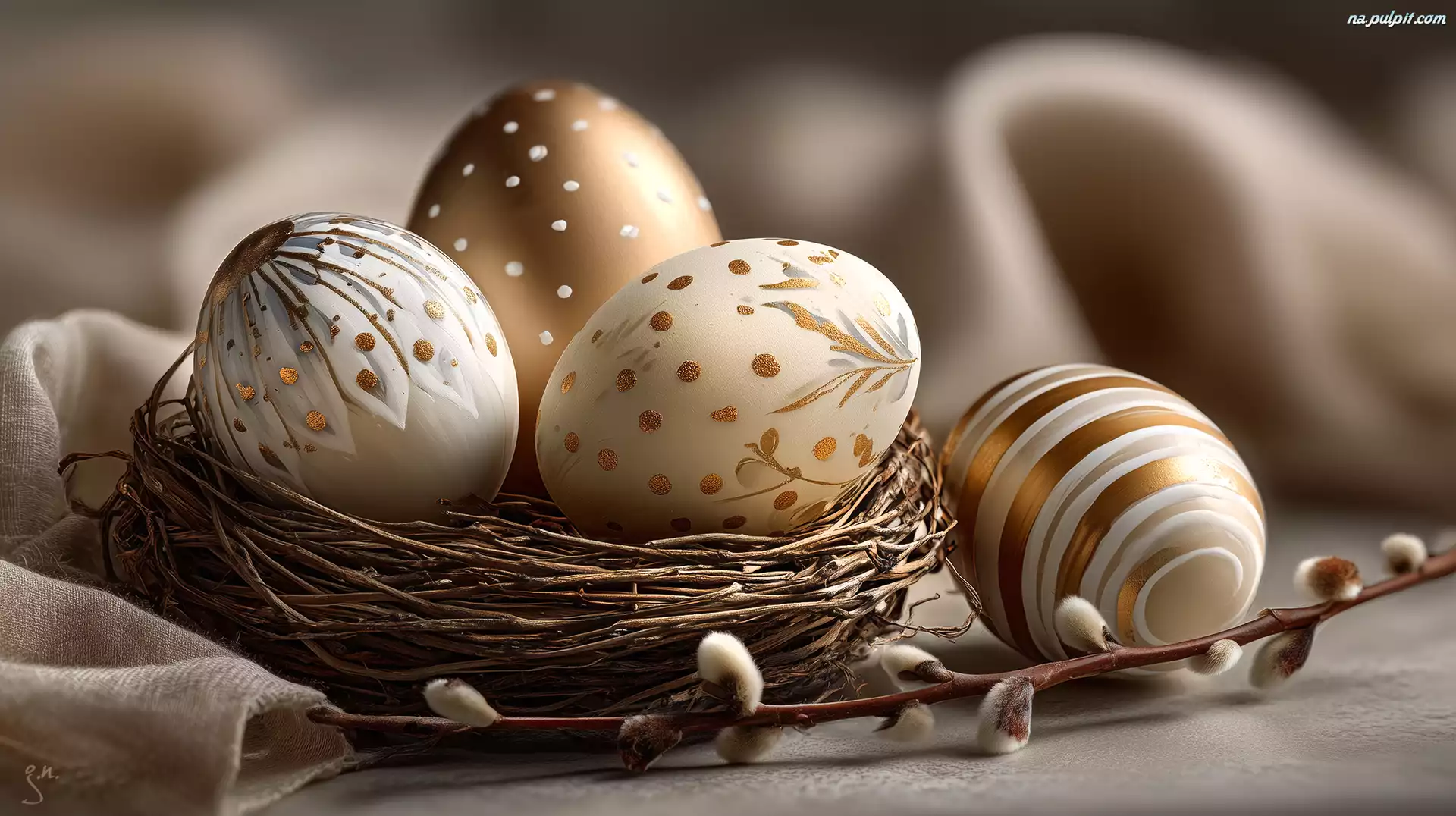 Wielkanoc, Złote, Gniazdko, Bazie, Pisanki, Grafika AI Na Pulpit