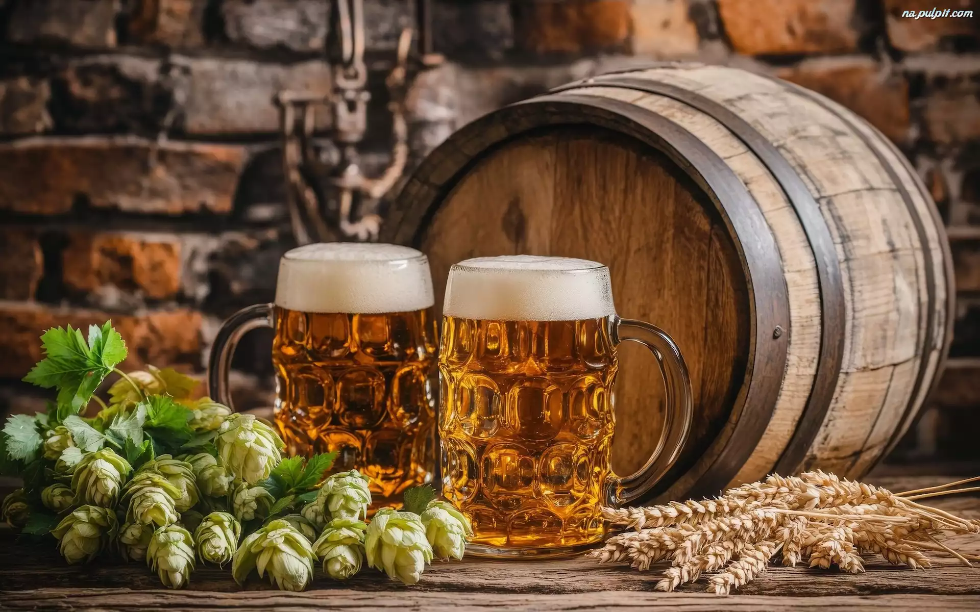 Rośliny, Chmiel, Kufle, Beczka, Piwo, Dwa, Kłosy