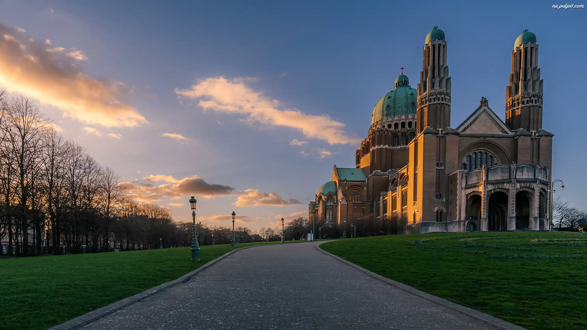 Narodowa Bazylika Najświętszego Serca, Droga, Domy, Belgia, Niebo, Drzewa, Bruksela, Kościół Na Pulpit |