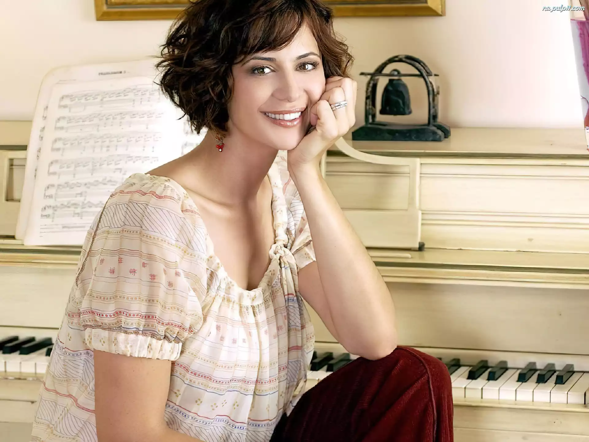 Catherine Bell, pianino maskotki, Catherine Bell, uśmiech granatowy, Catherine Bell, uniform fotel, skórzane, Catherine Bell, spodnie oczy, Catherine Bell, brązowe włosy, Catherine Bell, rude nuty, Catherine Bell, pianino