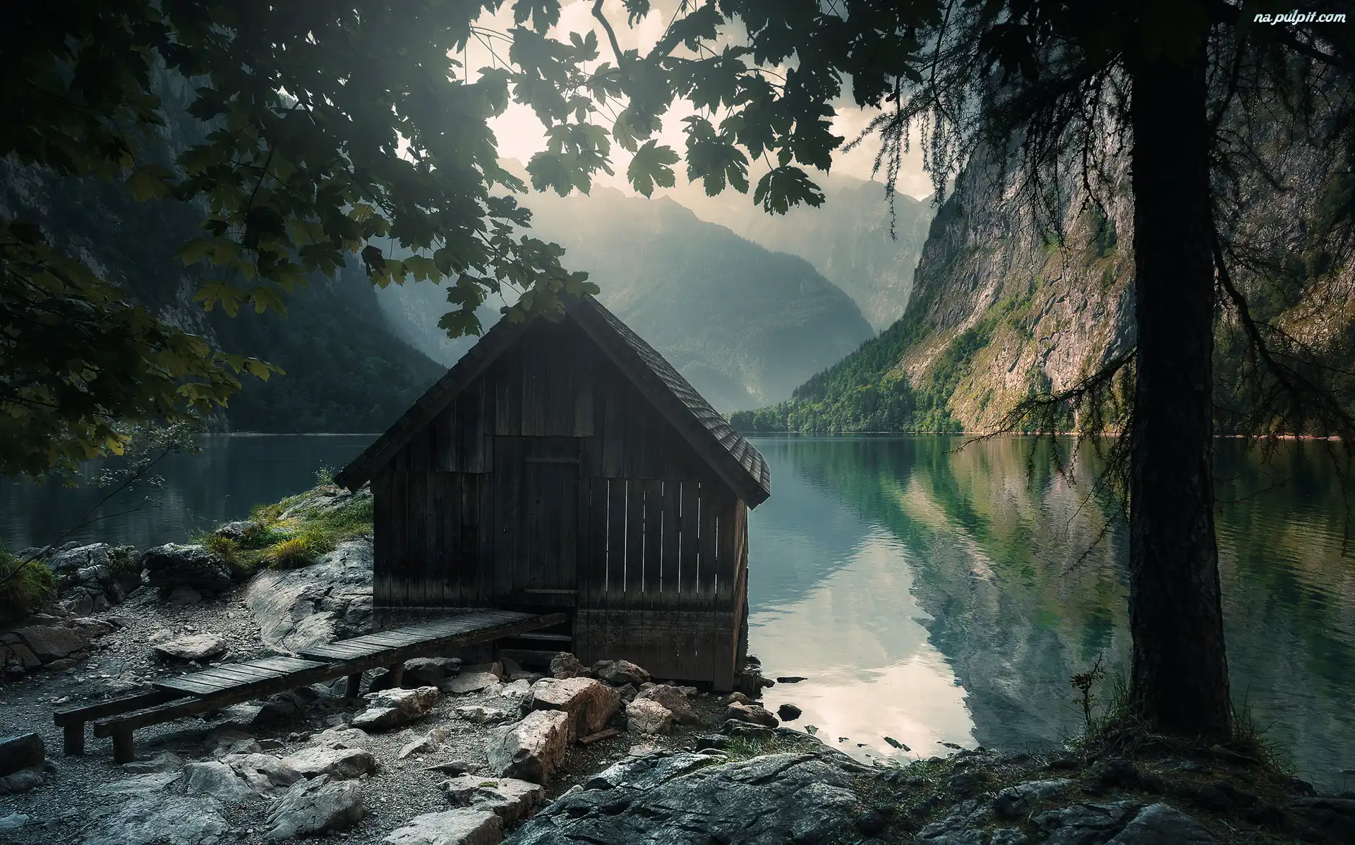 Park Narodowy Berchtesgaden, Drewniana, Chata, Bawaria, Niemcy, Jezioro Konigssee, Góry, Drzewa Na Pulpit |