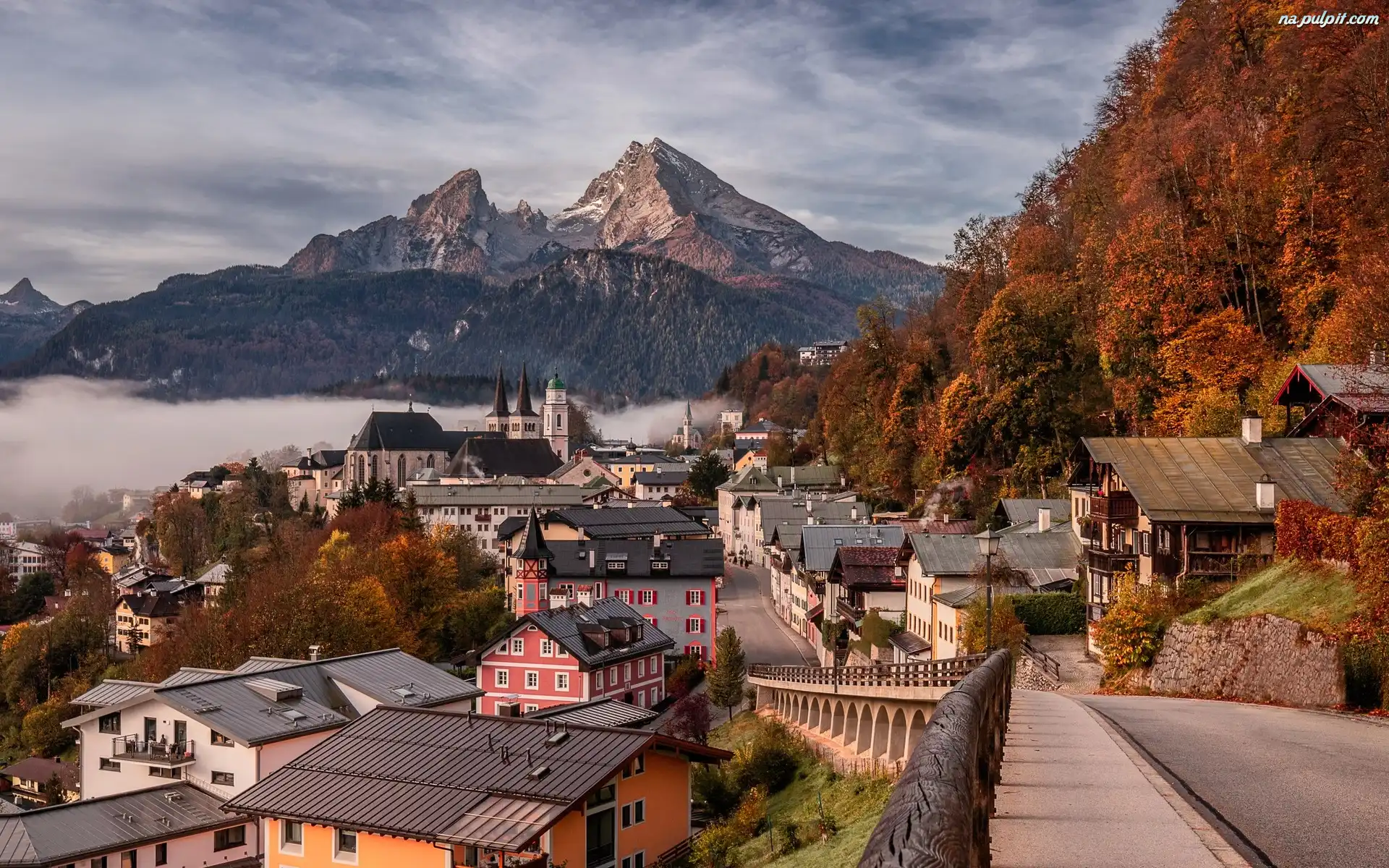 Domy, Góry, Kościół, Niemcy, Mgła, Drzewa, Bawaria, Berchtesgaden Na Pulpit