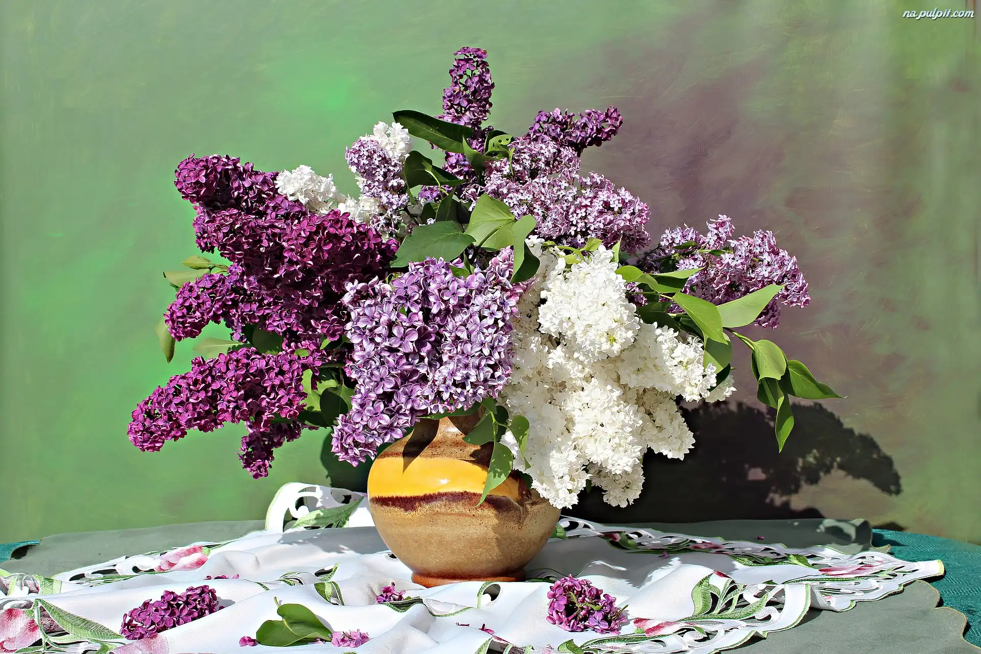 Bukiet, Bez, Lilak, Wazon, Obrus, Fioletowy, Kwiaty, Biały