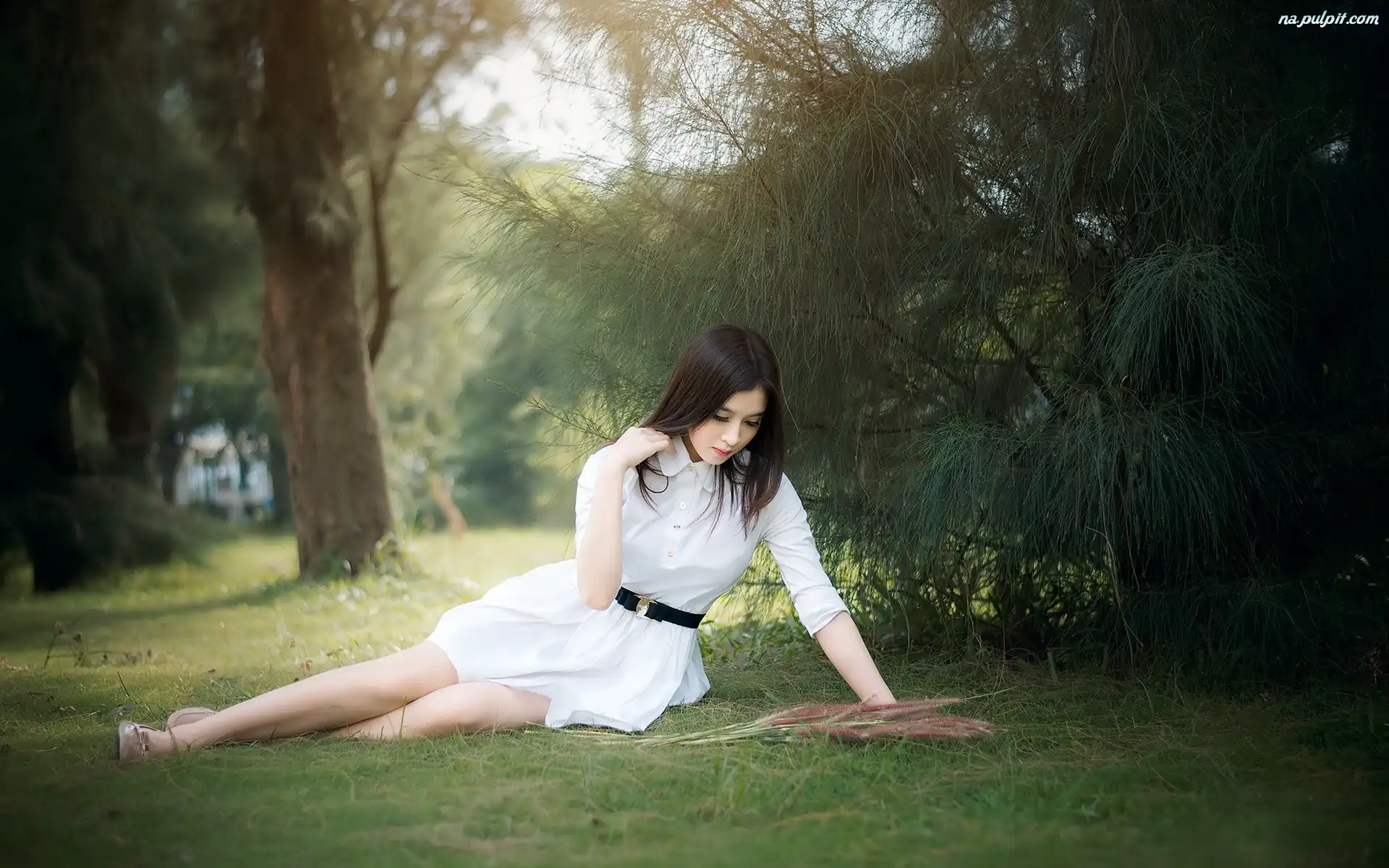 Biała, Drzewa, Trawa, Sukienka, Brunetka, Park