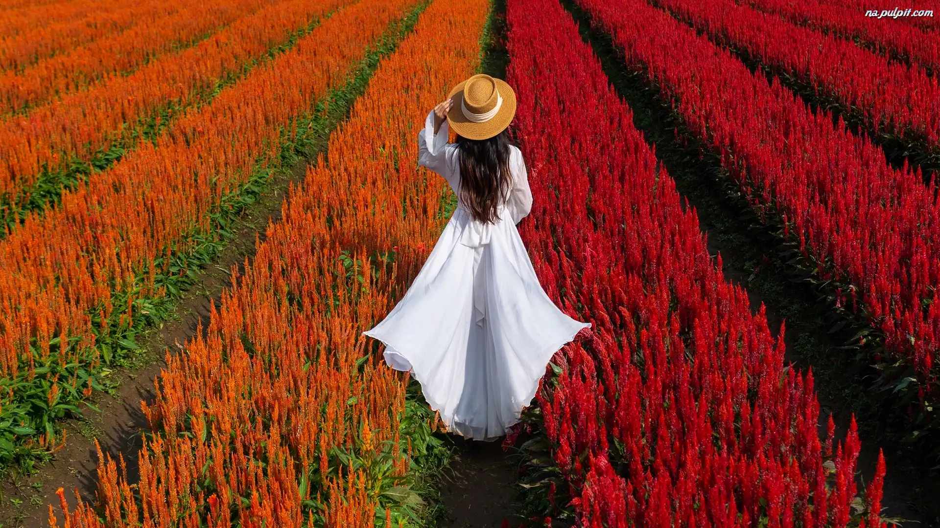 Celozja, Biała, Kwiaty, Kapelusz, Sukienka, Kobieta, Pole Na Pulpit