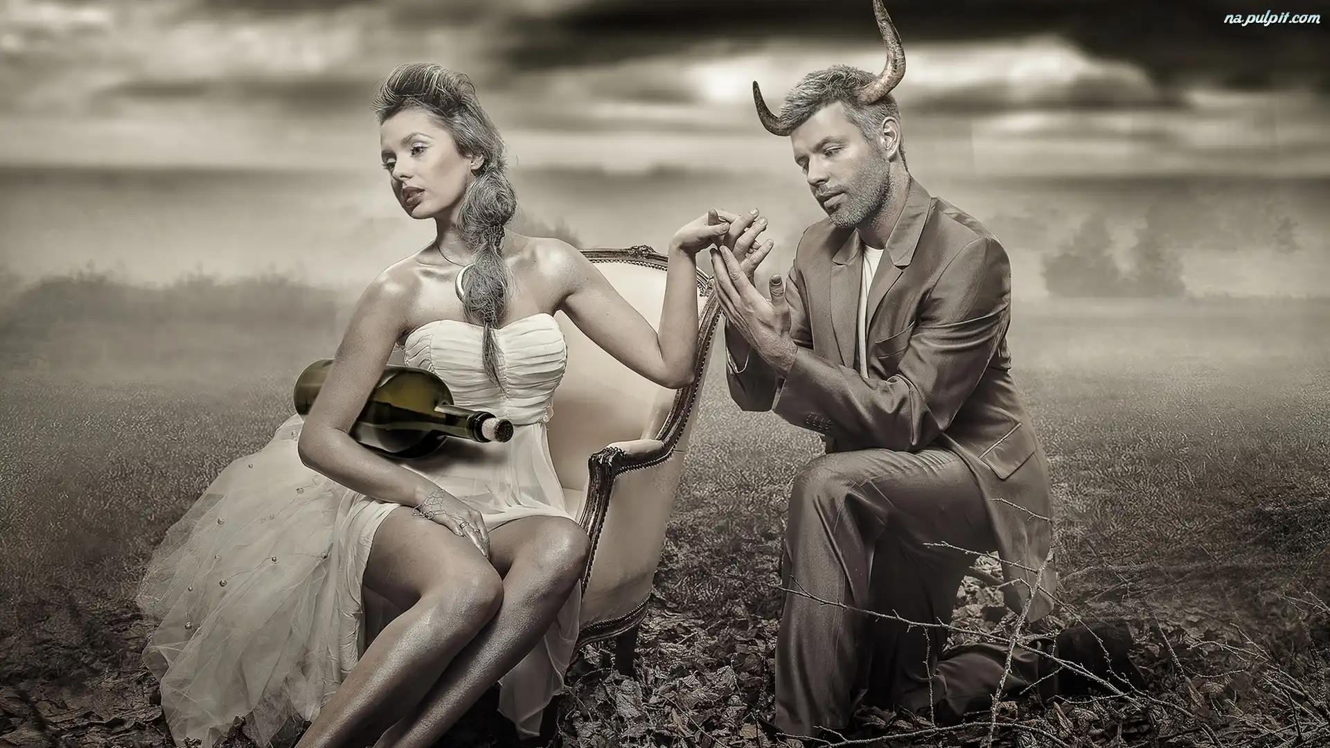 Biała, Mężczyzna, Rogi, Suknia, Kobieta, Butelka