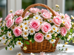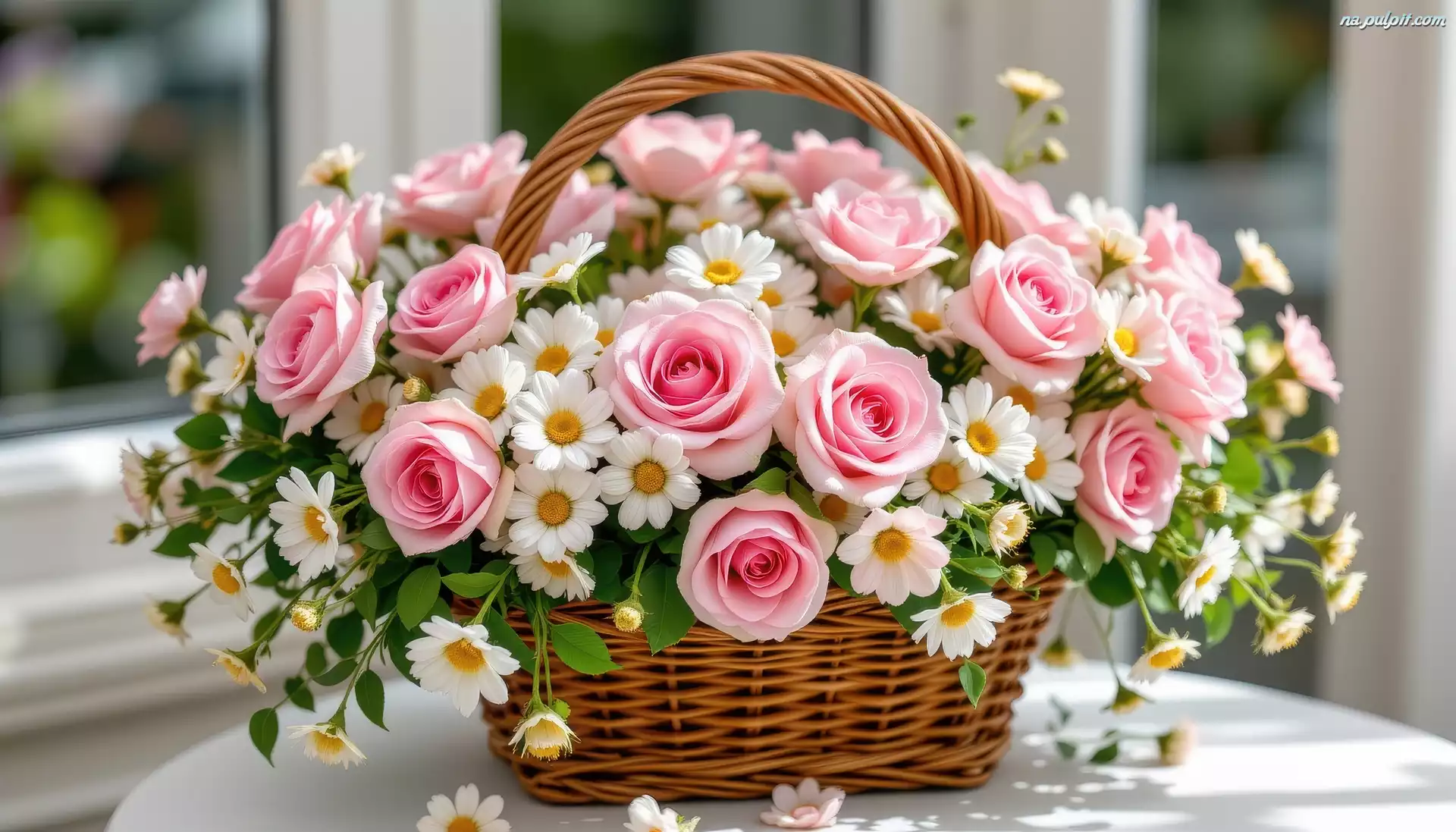 Stokrotki, Róże, Bukiet, Kwiaty, Stolik, Koszyk, Różowe, Białe Na Pulpit