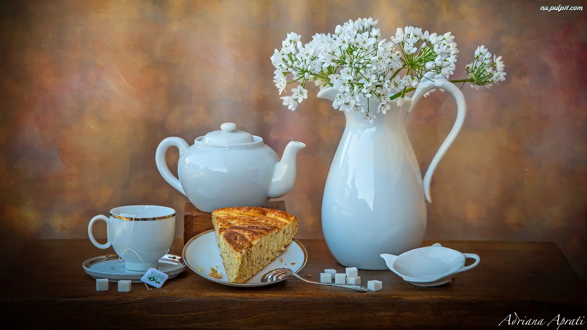 Ciasto, Białe, Filiżanka, Dzbanek, Kwiaty, Kompozycja, Imbryk Na Pulpit