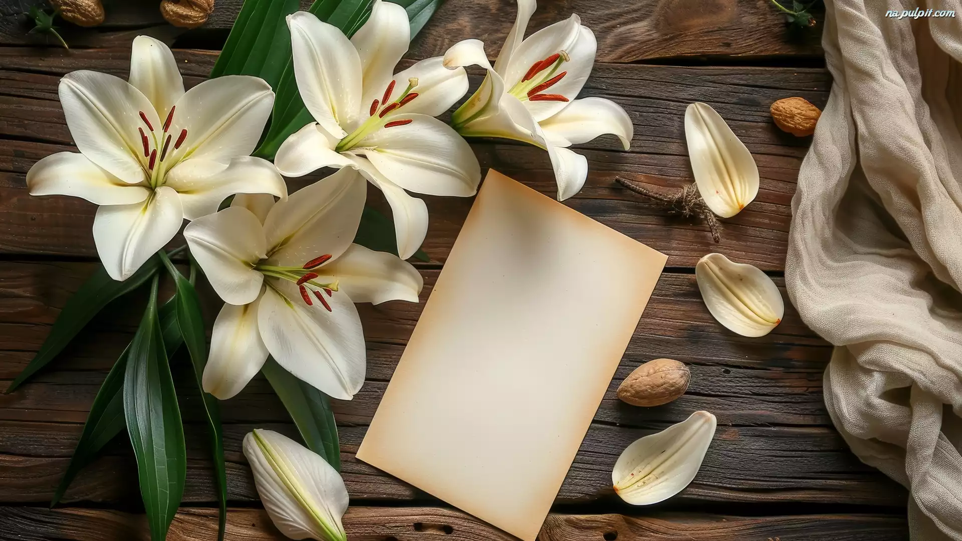 Kartka, Kompozycja, Lilie, Białe, Kwiaty, Drewno