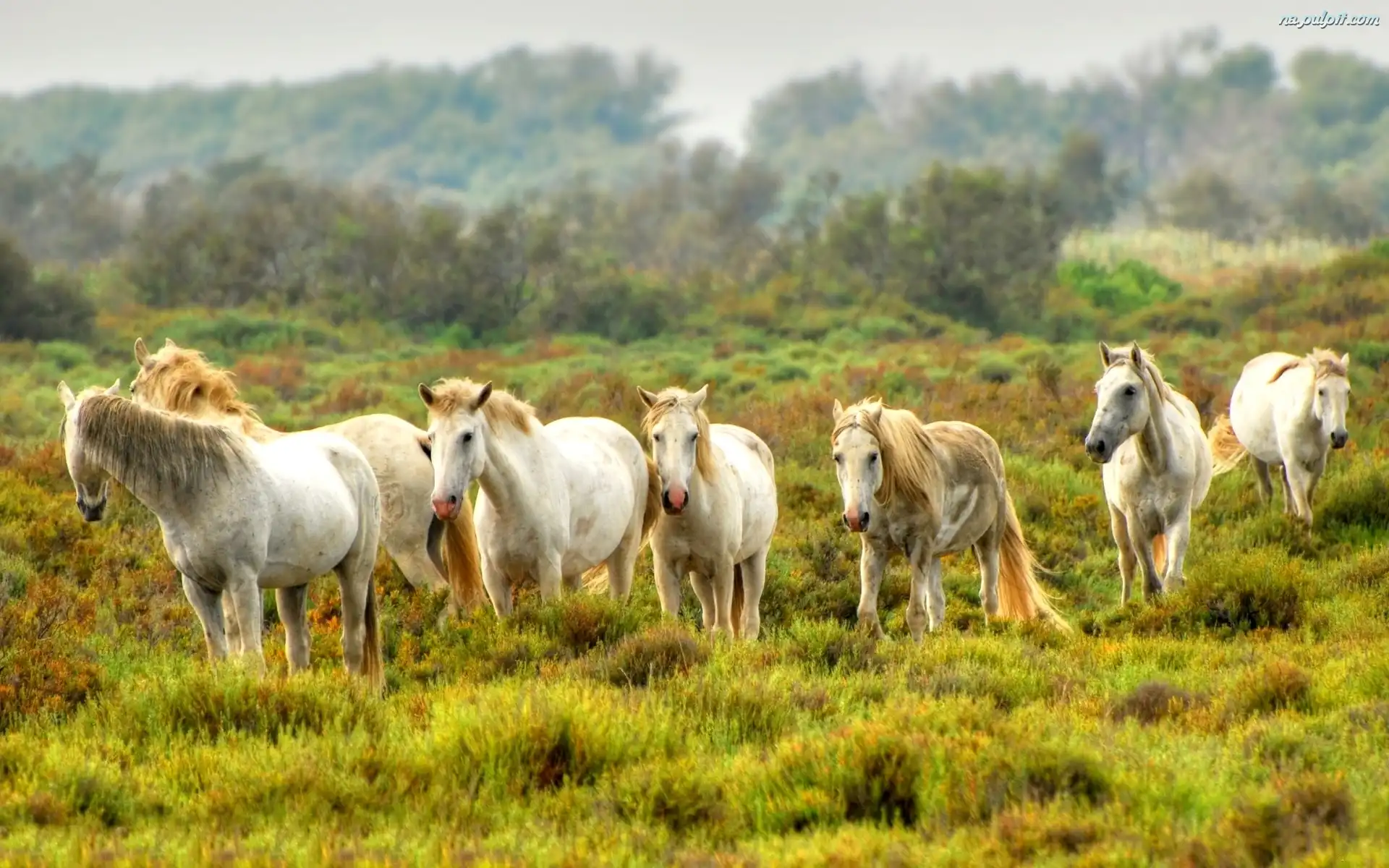 Łąka, Konie, Białe, Stado