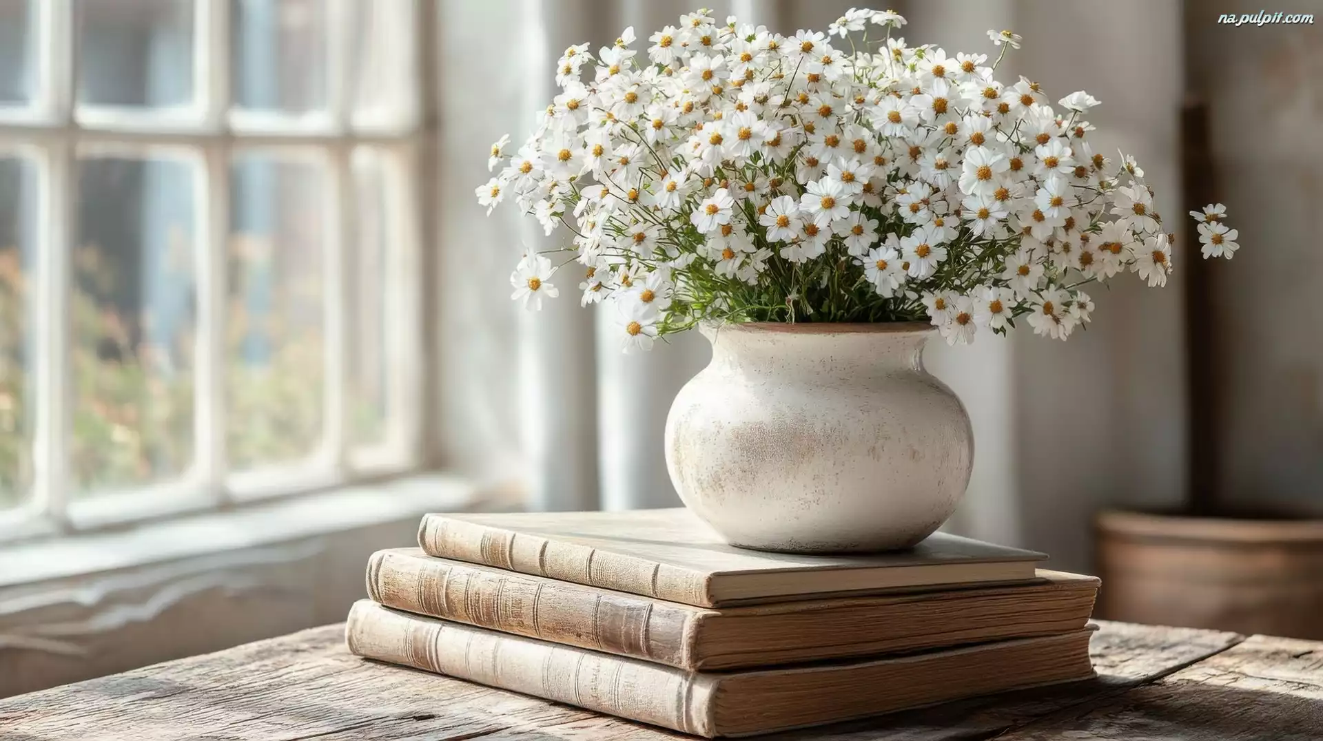 Wazon, Białe, Kwiaty, Okno, Książki Na Pulpit