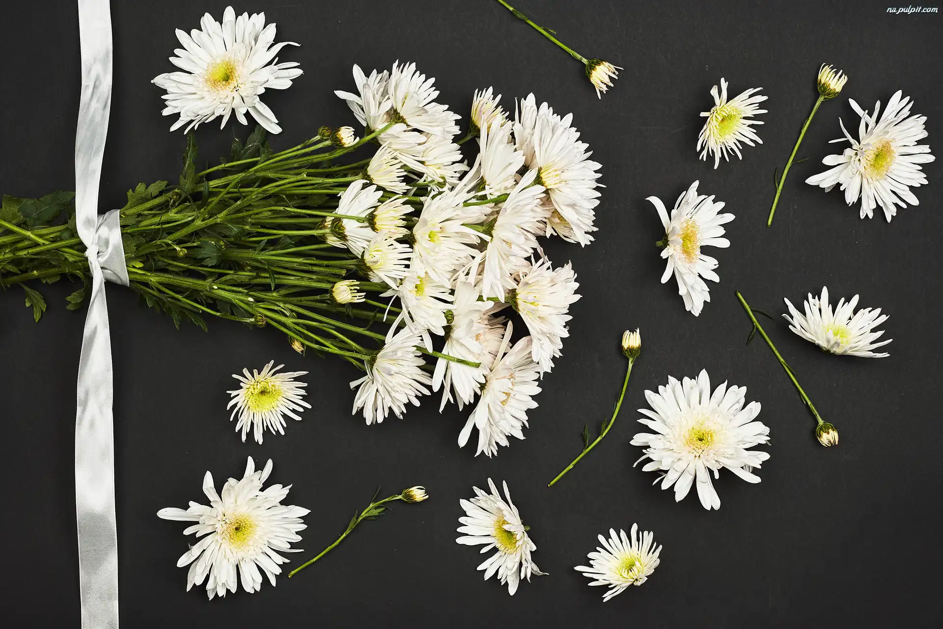 Białe, Ciemne, Tło, Chryzantemy, Kwiaty, Wstążka