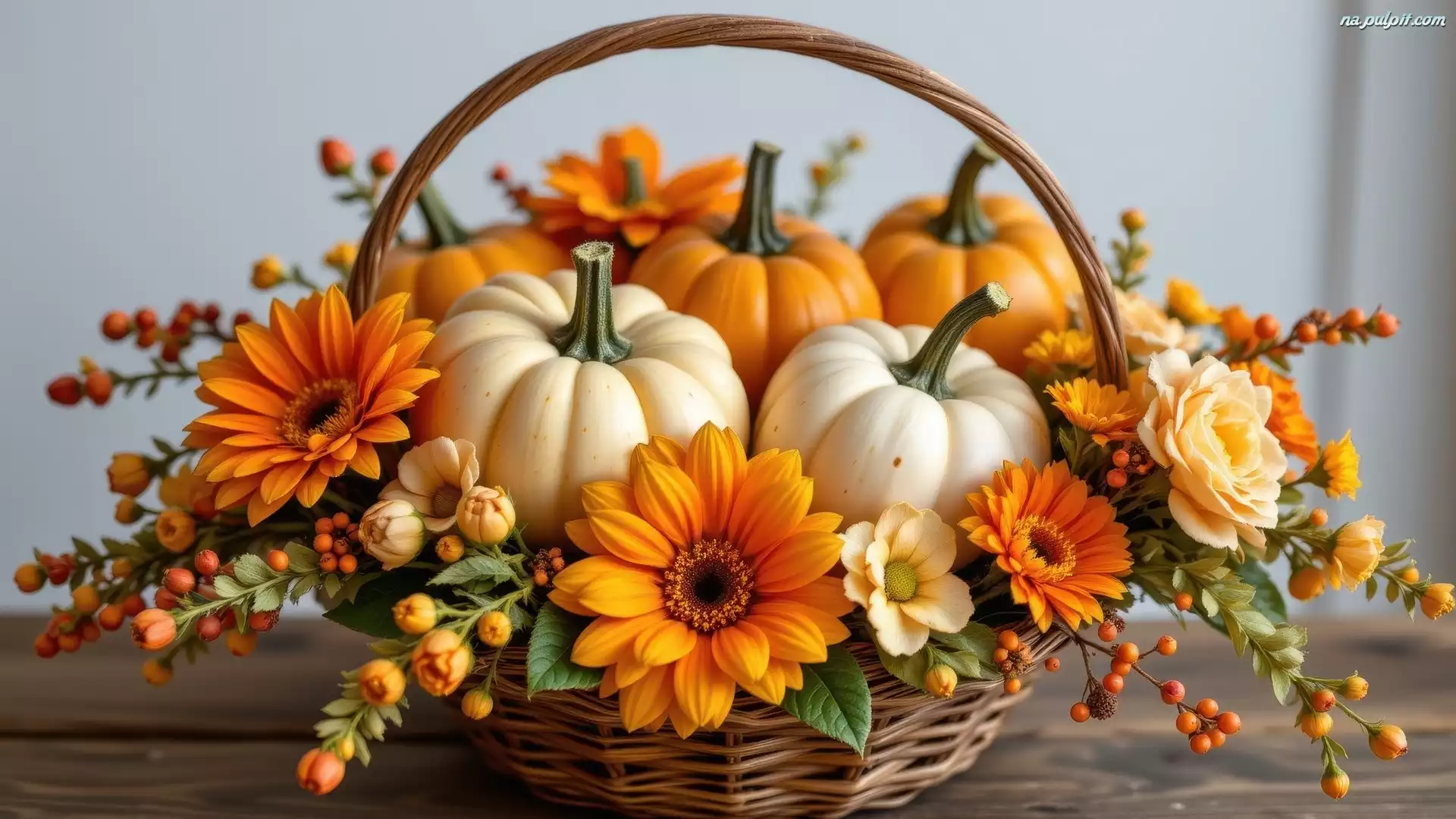 Koszyk, Kwiaty, Pomarańczowe, Białe, Żółte, Dynie, Wiklinowy Na Pulpit
