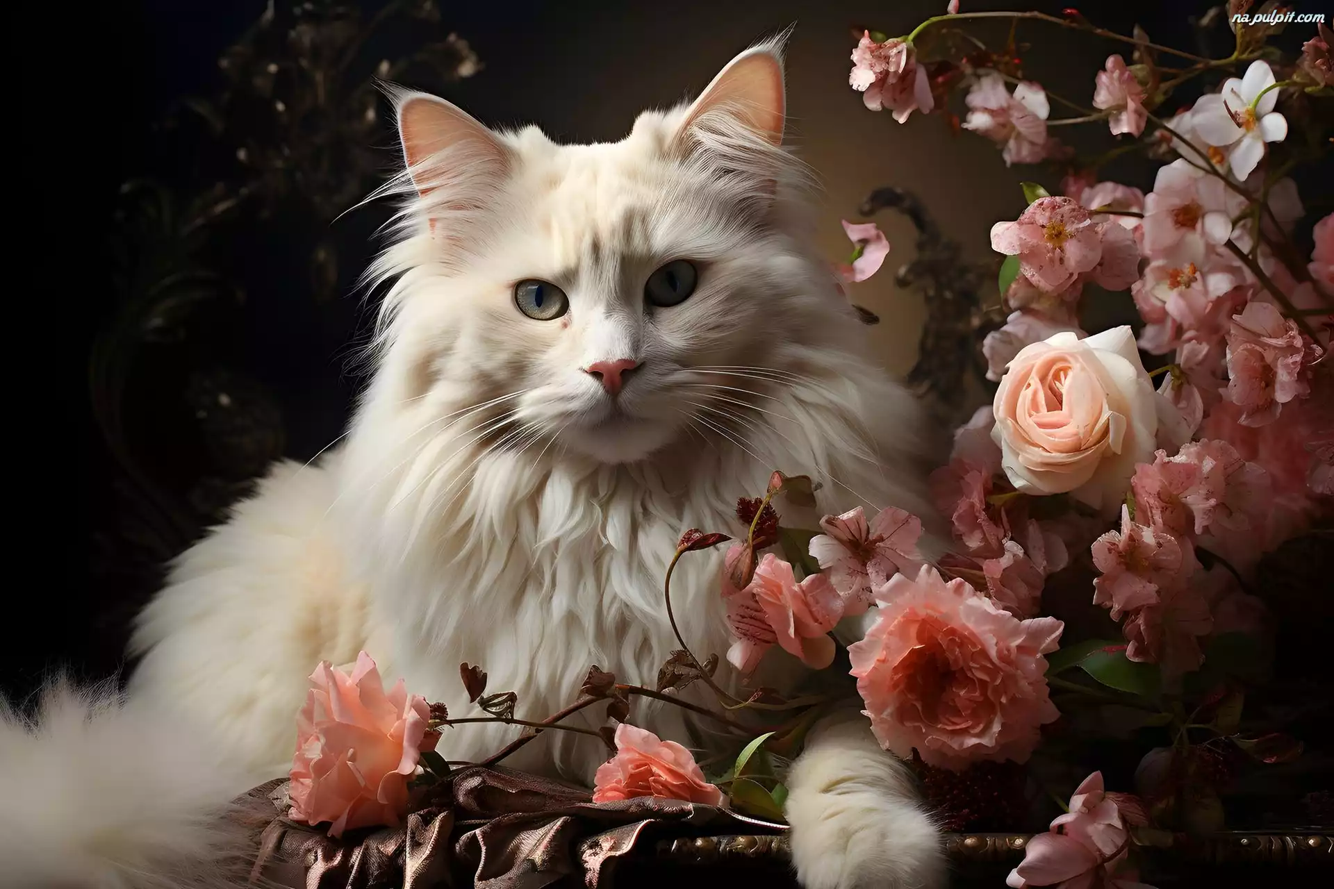 Kwiaty, Biały, Długowłosy, Róże, Kot Na Pulpit