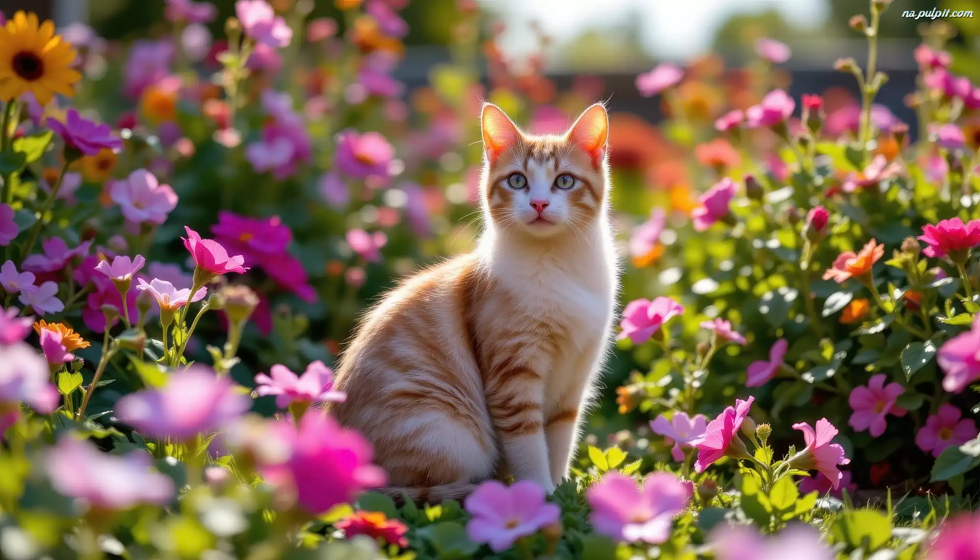 Rudo-biały, Kot, Kolorowe, Kwiaty Na Pulpit