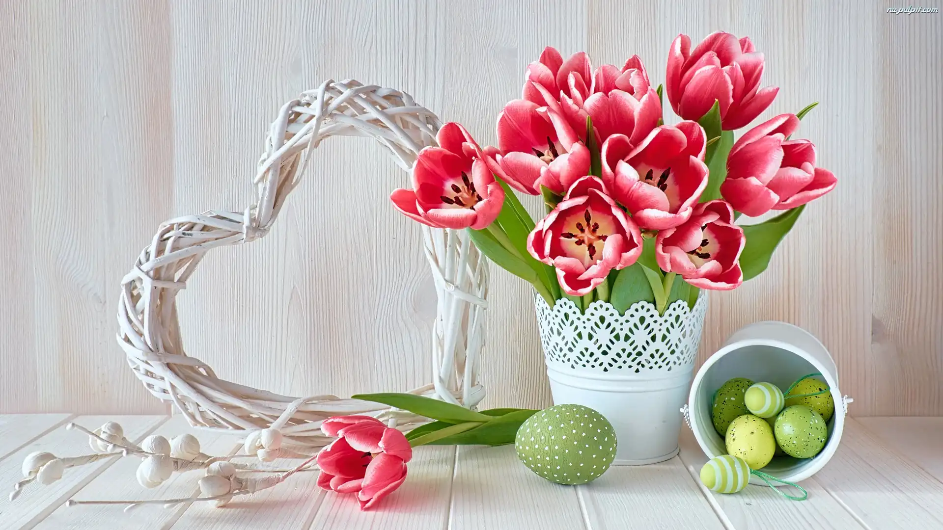 Wiklinowe, Biały, Wazon, Serce, Wielkanoc, Wiaderko, Tulipany, Pisanki Na Pulpit