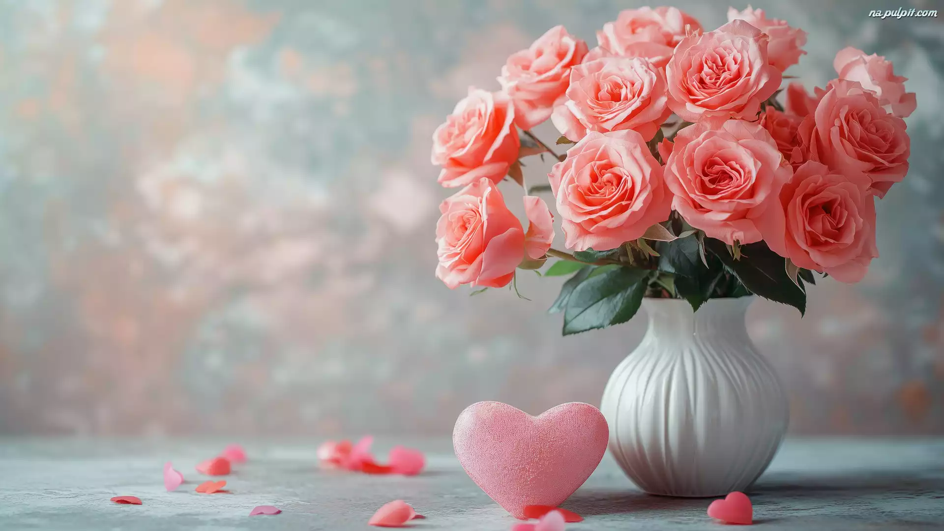 Wazon, Kwiaty, Róże, Biały, Różowe, Serca Na Pulpit