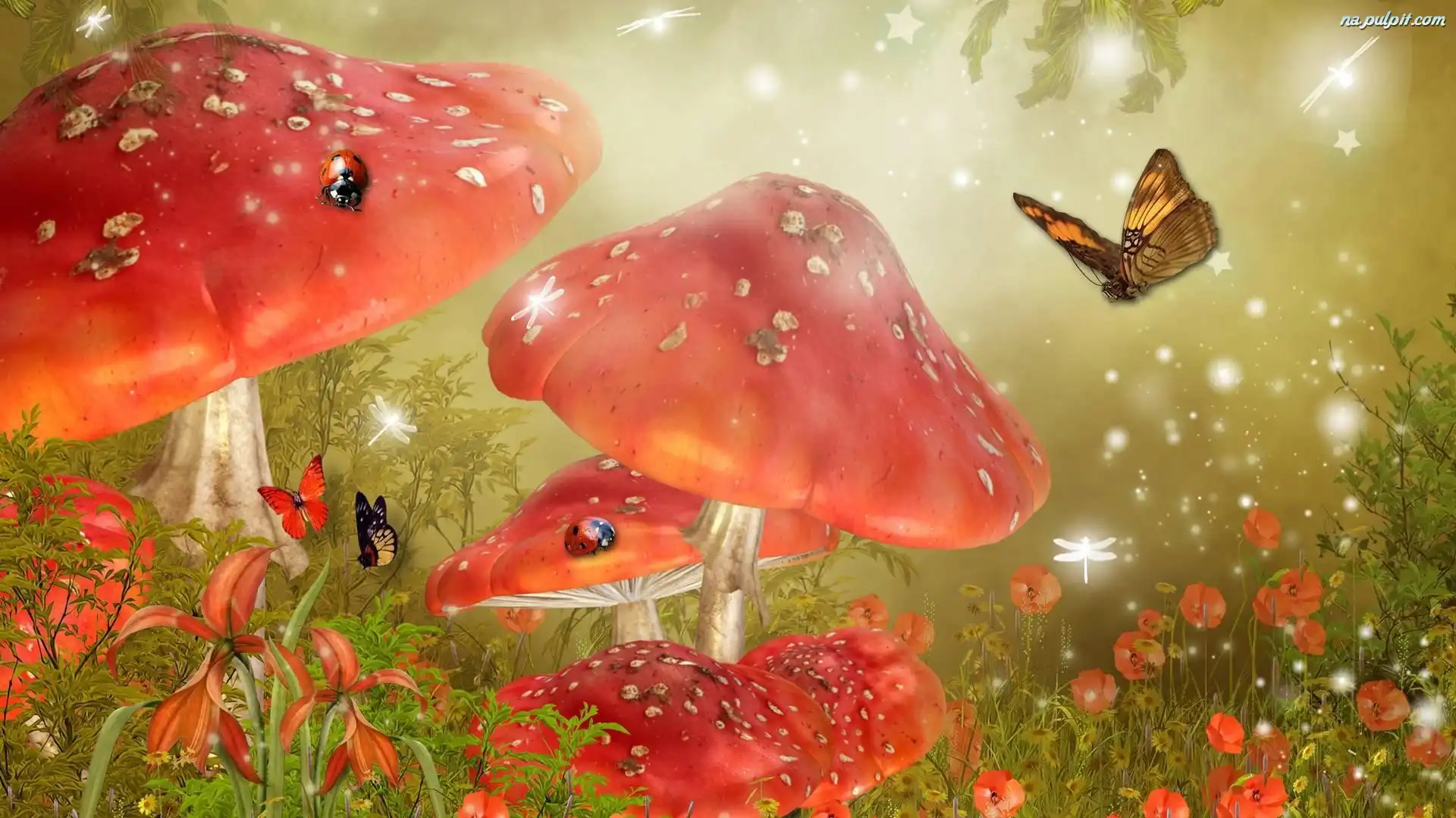 Biedronki, Grzyby, Łąka, Motyle Na Pulpit