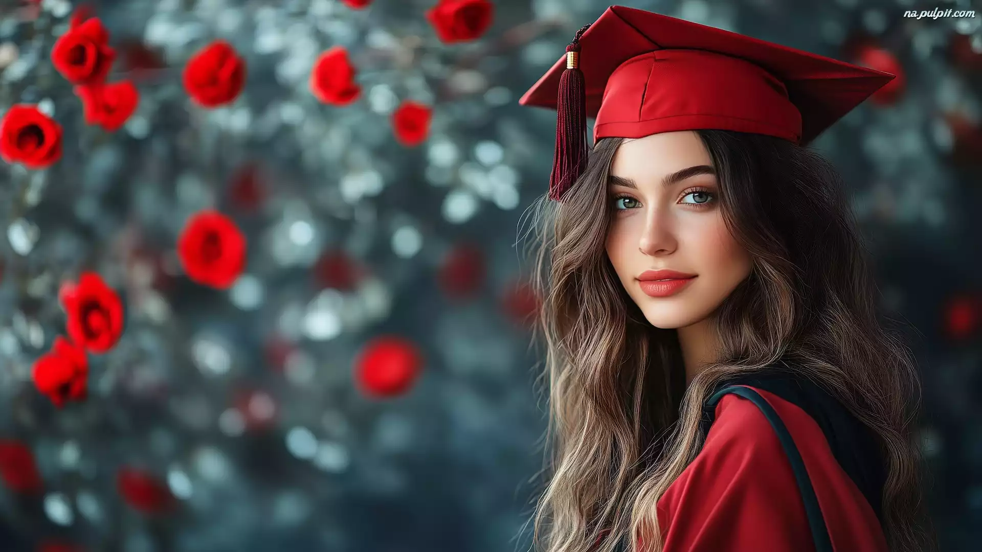 Toga, Kobieta, Czerwony, Biret, Studentka, Kwiaty
