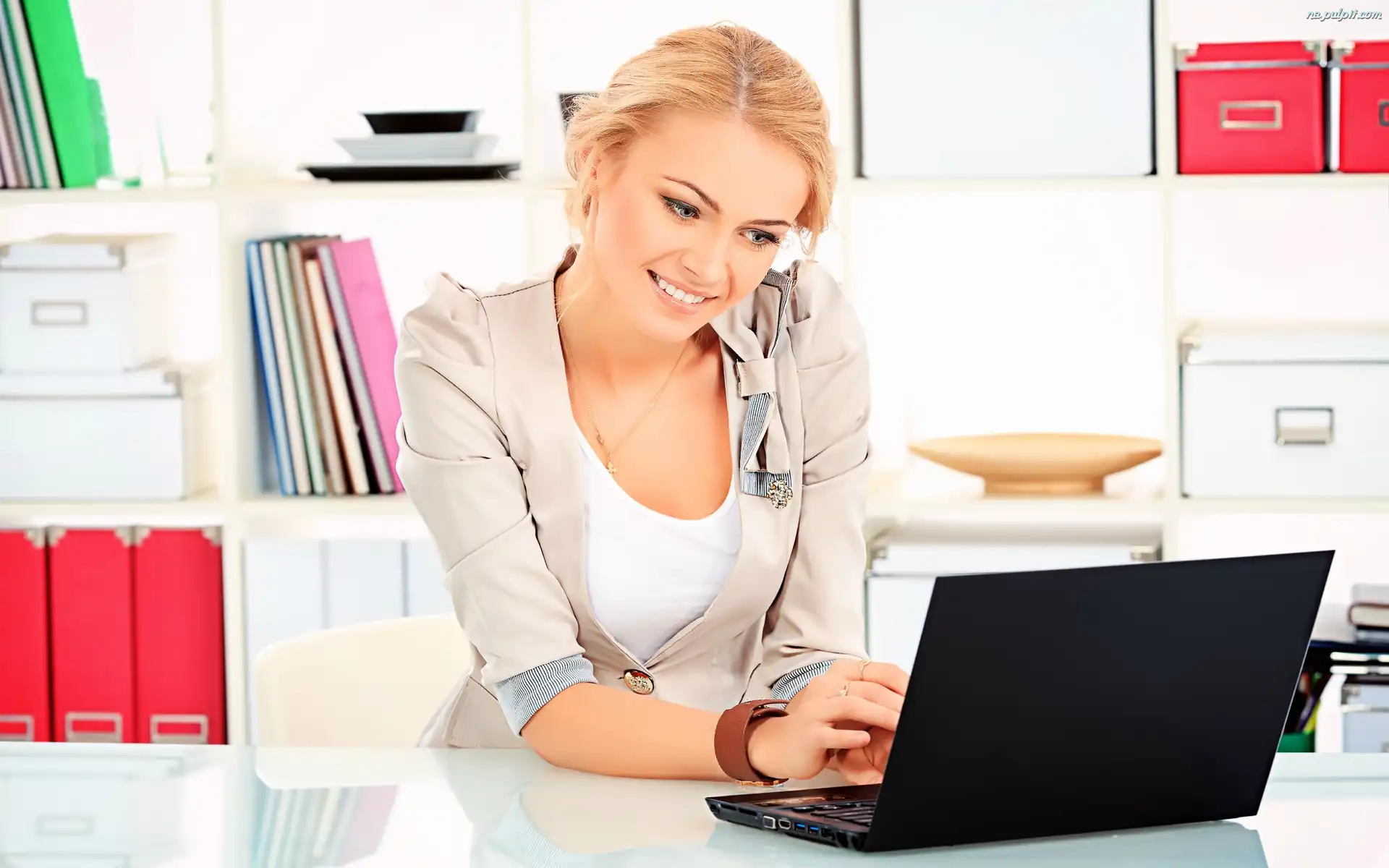 Biuro, Blondynka, Uśmiechnięta, Laptop