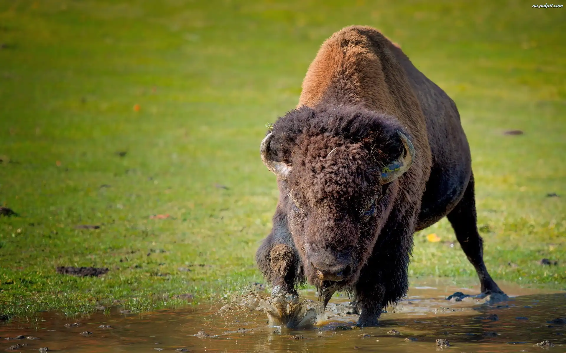 Zima, O艣nie偶one, Bizony, G贸ry Bizon Drzewa, Bizony, Mg艂a Stado, Bizon贸w Wyoming, Bizon, Yellowstone National Park Trawa, Bizon, G贸ry G贸ry, Bizon, Trawa G艂az, Woda, Bizon, Trawa Bizony, Las, Trawa Bizon S艂o艅ca, Bizony, Zach贸d G贸r, Bizon贸w, Stado, Szczyty Bizony G贸ry, Bizony, 艁膮ka