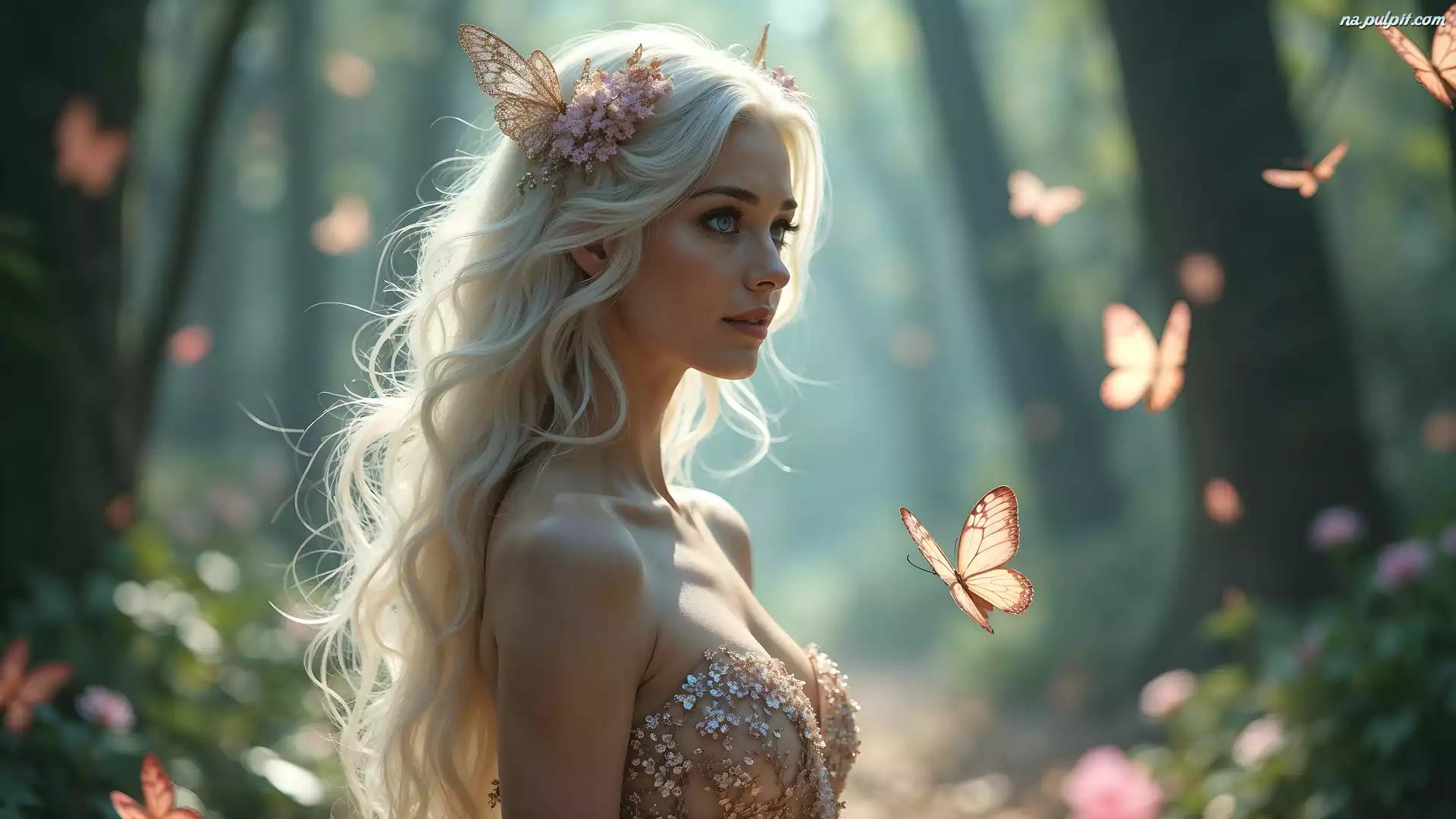 Kobieta, Blondynka, Motyle, Grafika AI Na Pulpit