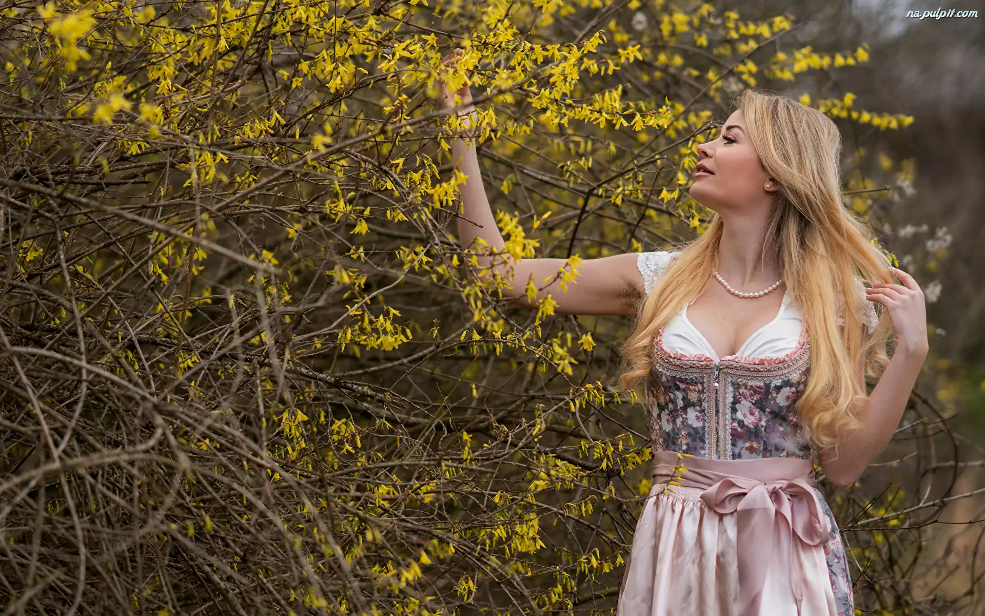 Kobieta, KwitnÄ…cy, Forsycja, Blondynka, Krzew, Sukienka Na Pulpit