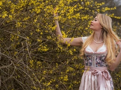 Kobieta, KwitnÄ…cy, Forsycja, Blondynka, Krzew, Sukienka