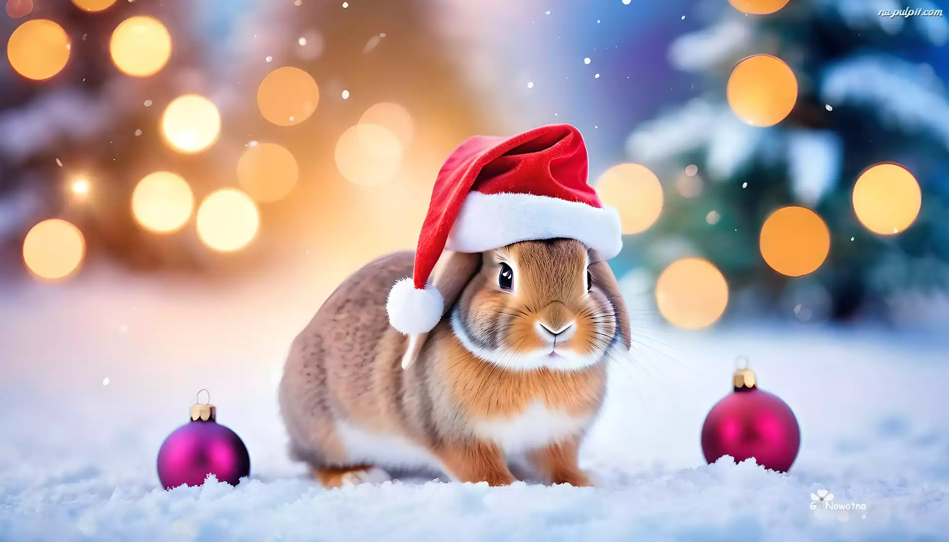 Śnieg, Królik, Mikołaj, Bombki, Czapka, Grafika Na Pulpit