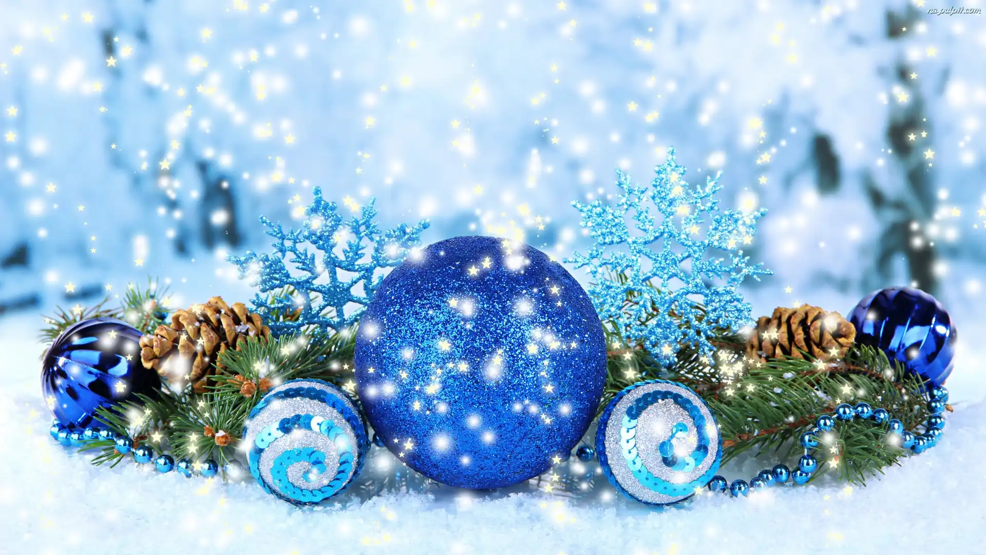 Śnieg, Kompozycja, Szyszki, Niebieskie, Boże Narodzenie, Świąteczna, Bombki