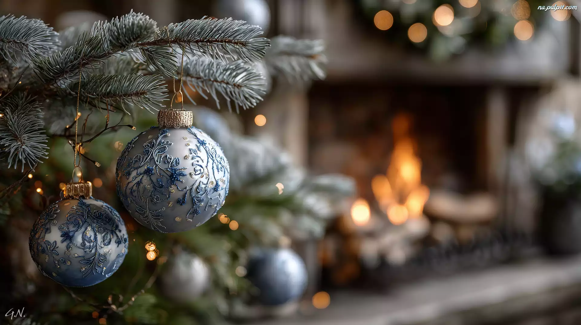 Choinka, Boże Narodzenie, Niebiesko-srebrne, Grafika AI, Bombki Na Pulpit