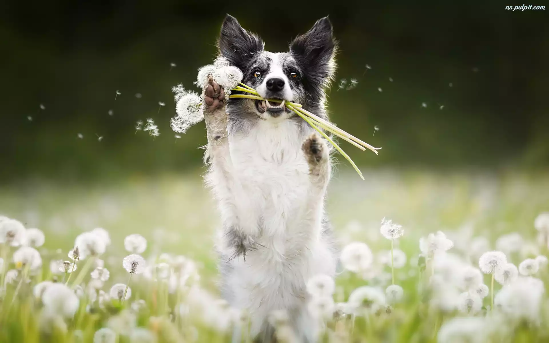 Pies, Border collie, Łąka, Dmuchawce Na Pulpit