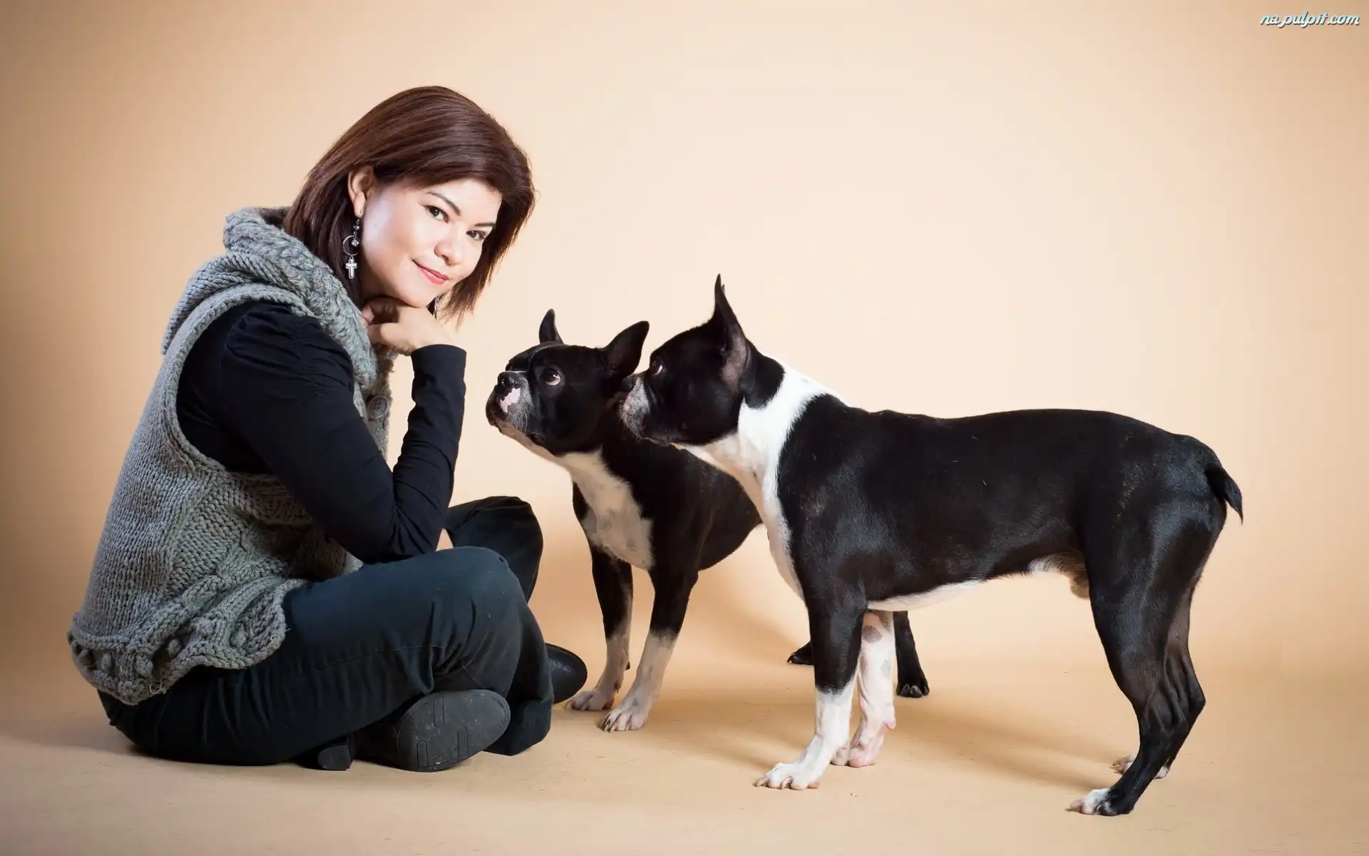 Boston terriery, Kobieta, Dwa Na Pulpit