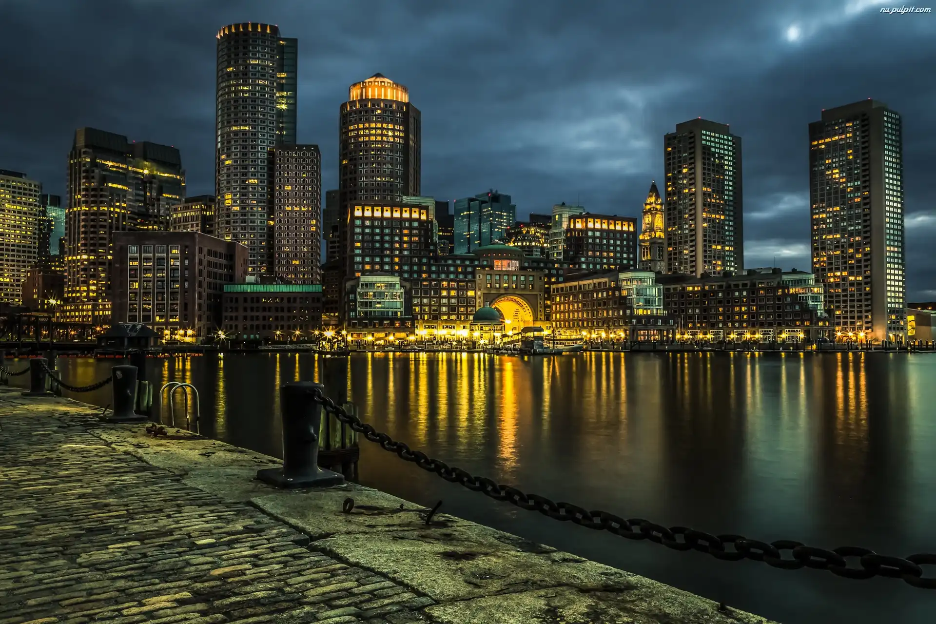 Stany Zjednoczone, Nabrzeże, Stan Massachusetts, Wieżowce, Domy, Noc, Boston Na Pulpit