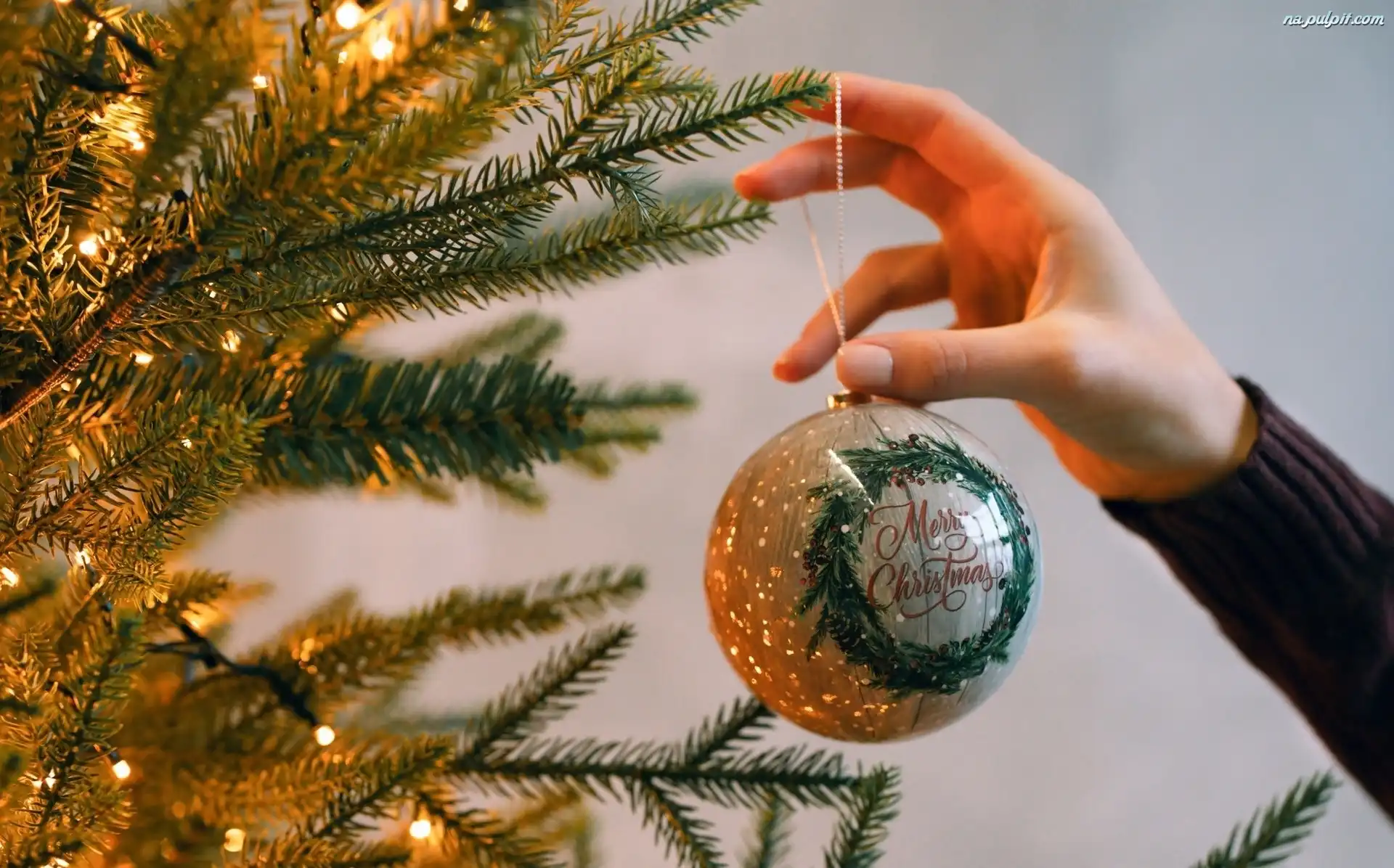 Boże Narodzenie, Napis, Bombka, Choinka, Dłoń