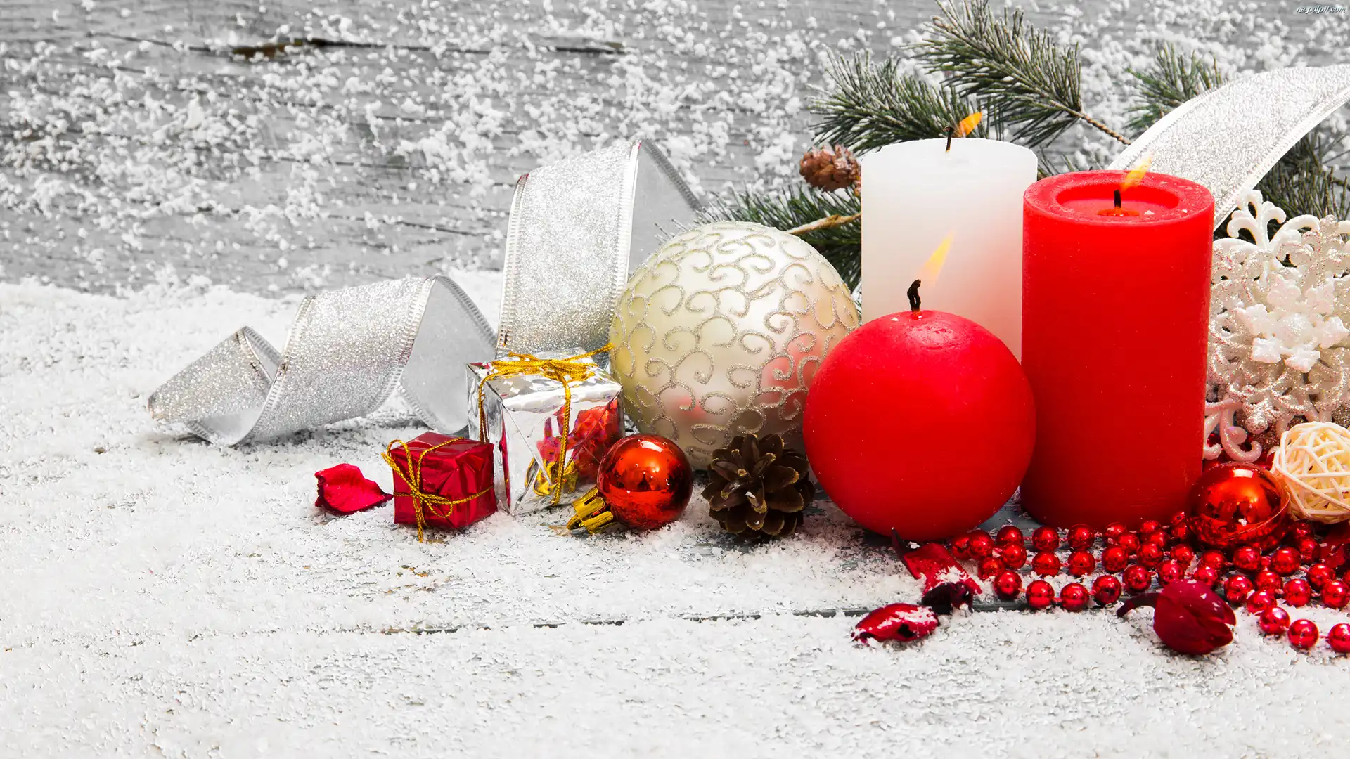 Ozdoby, Boże Narodzenie, Wstążka, Bombki, Świece, Kompozycja, Gałązki