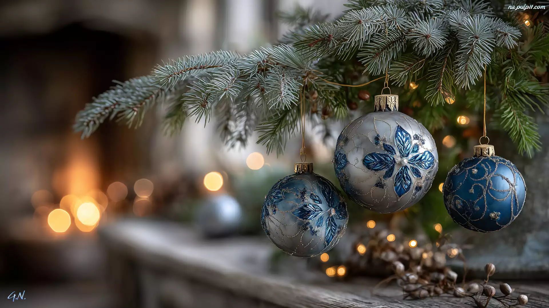 Narodzenie, Niebieskie, Jodła, Boże, Bombki, Grafika AI Na Pulpit