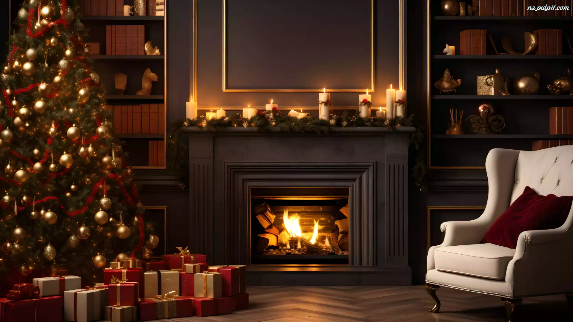 Półki, Choinka, Prezenty, Pokój, Świece, Ogień, Boże Narodzenie, Bombki, Kominek, Fotel Na Pulpit |