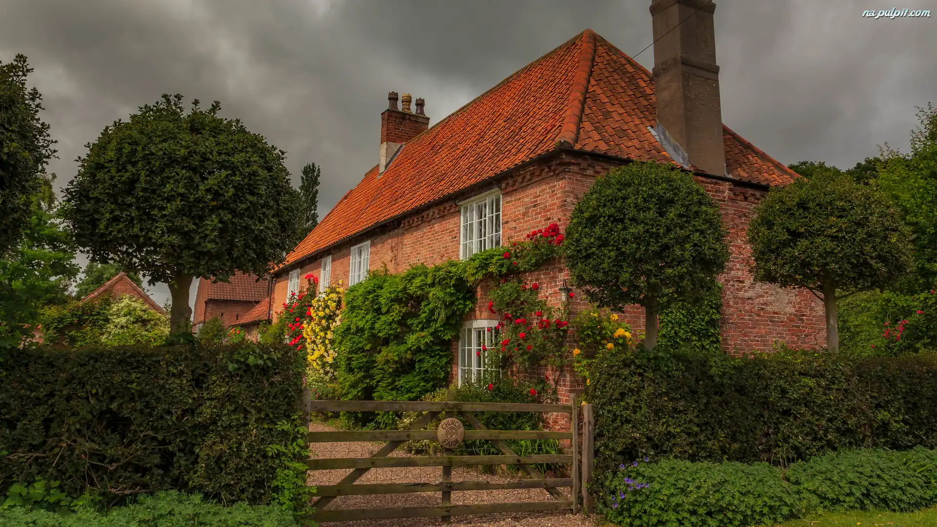 Brama, Drzewa, Dom, Ceglany, Żywopłot Na Pulpit